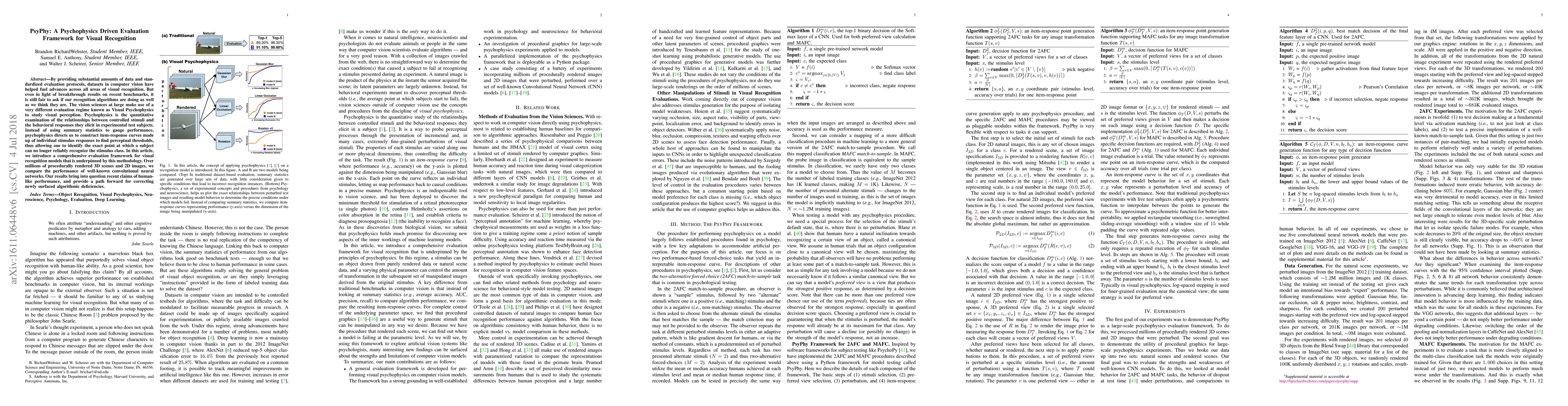 By providing substantial amounts of data and standardized evaluation protocols, datasets in computer vision have helped fuel advances across all areas of visual recognition. But even in light of breakthrough results on recent benchmarks, it is still fair to ask if our recognition algorithms are doing as well as we think they are. The vision sciences at large make use of a very different evaluation regime known as Visual Psychophysics to study visual perception. Psychophysics is the quantitative examination of the relationships between controlled stimuli and the behavioral responses they elicit in experimental test subjects. Instead of using summary statistics to gauge performance, psychophysics directs us to construct item-response curves made up of individual stimulus responses to find perceptual thresholds, thus allowing one to identify the exact point at which a subject can no longer reliably recognize the stimulus class. In this article, we introduce a comprehensive evaluation framework for visual recognition models that is underpinned by this methodology. Over millions of procedurally rendered 3D scenes and 2D images, we compare the performance of well-known convolutional neural networks. Our results bring into question recent claims of human-like performance, and provide a path forward for correcting newly surfaced algorithmic deficiencies.