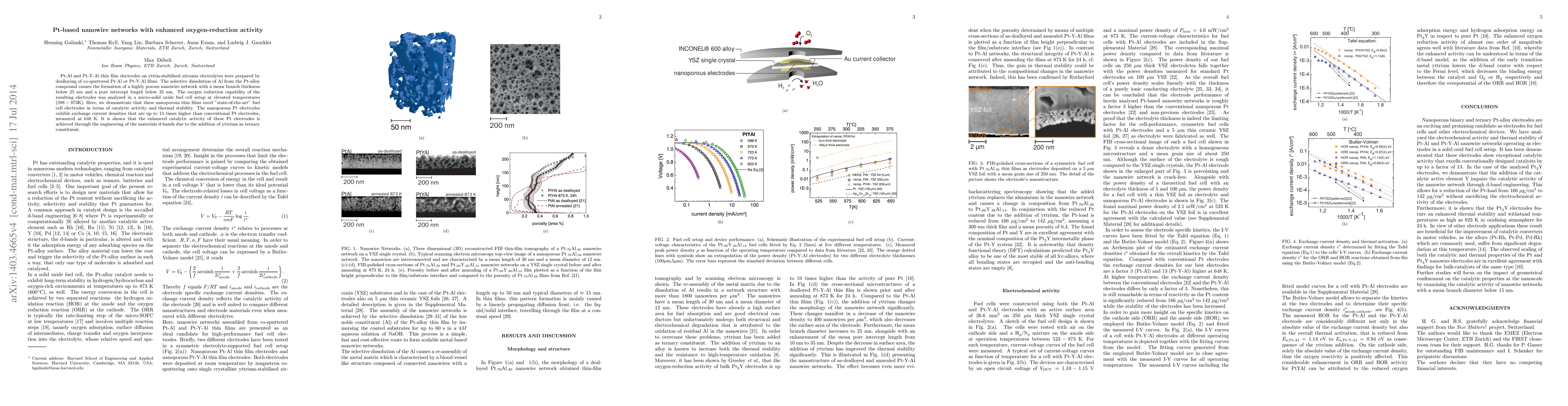 This paper investigates Pt-based nanowire networks created by dealloying Pt-Al and Pt-Y-Al thin films, showing enhanced oxygen reduction activity in solid oxide fuel cells. The engineered nanowires exhibit up to 13 times higher catalytic activity and superior thermal stability compared to conventional Pt electrodes.