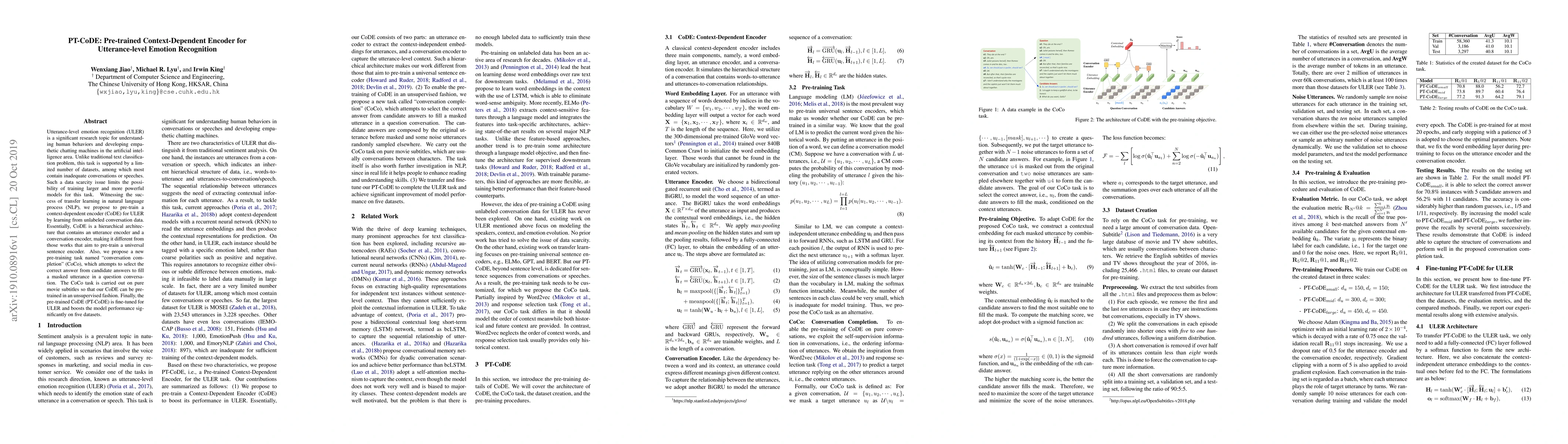 The paper introduces PT-CoDE, a pre-trained context-dependent encoder for utterance-level emotion recognition, addressing the data scarcity issue in this field. The model is pre-trained using an unsupervised "conversation completion" task on movie subtitles, significantly improving performance on five emotion recognition datasets.