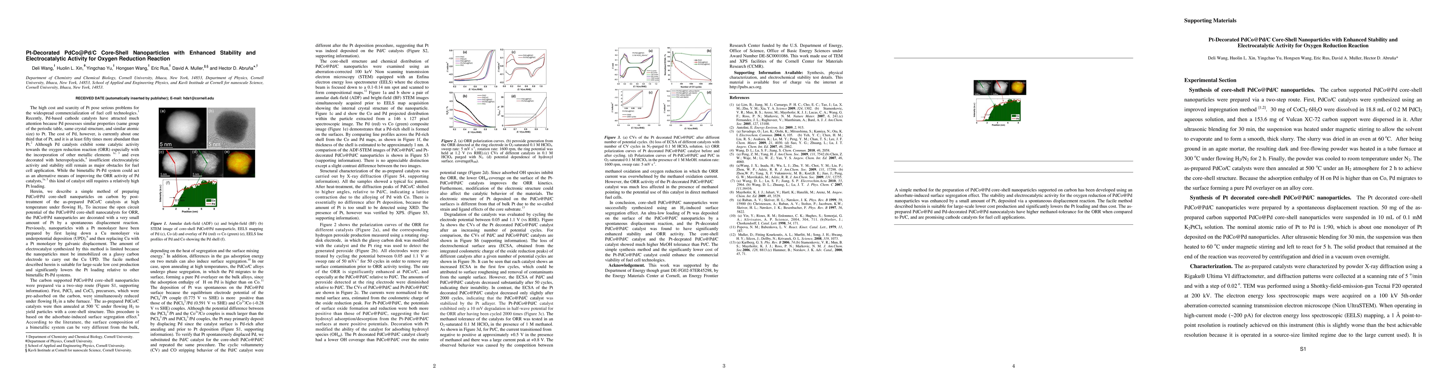 This paper describes a method for creating PdCo@Pd core-shell nanoparticles on carbon, enhanced by Pt decoration, which shows improved stability and electrocatalytic activity for oxygen reduction reactions. The Pt-decorated nanoparticles offer higher methanol tolerance compared to Pt/C, making them promising for fuel cell applications.