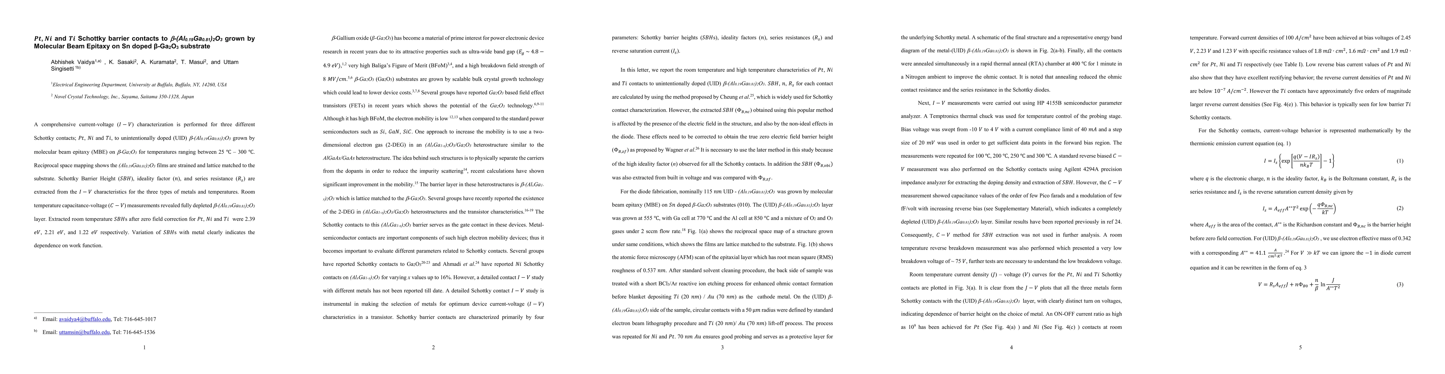 A comprehensive current-voltage (I-V) characterization is performed for three different Schottky contacts; Pt, Ni and Ti, to unintentionally doped (UID) \{beta}-(Al0.19Ga0.81)2O3 grown by molecular beam epitaxy (MBE) on \{beta}-Ga2O3 for temperatures ranging between 25C -300C. Reciprocal space mapping shows the (Al0.19Ga0.81)2O3 films are strained and lattice matched to the substrate. Schottky Barrier Height (SBH), ideality factor (n), and series resistance (Rs) are extracted from the I-V characteristics for the three types of metals and temperatures. Room temperature capacitance-voltage (C-V) measurements revealed fully depleted \{beta}-(Al0.19Ga0.81)2O3 layer. Extracted room temperature SBHs after zero field correction for Pt, Ni and Ti were 2.39 eV, 2.21 eV, and 1.22 eV respectively. Variation of SBHs with metal clearly indicates the dependence on work function.