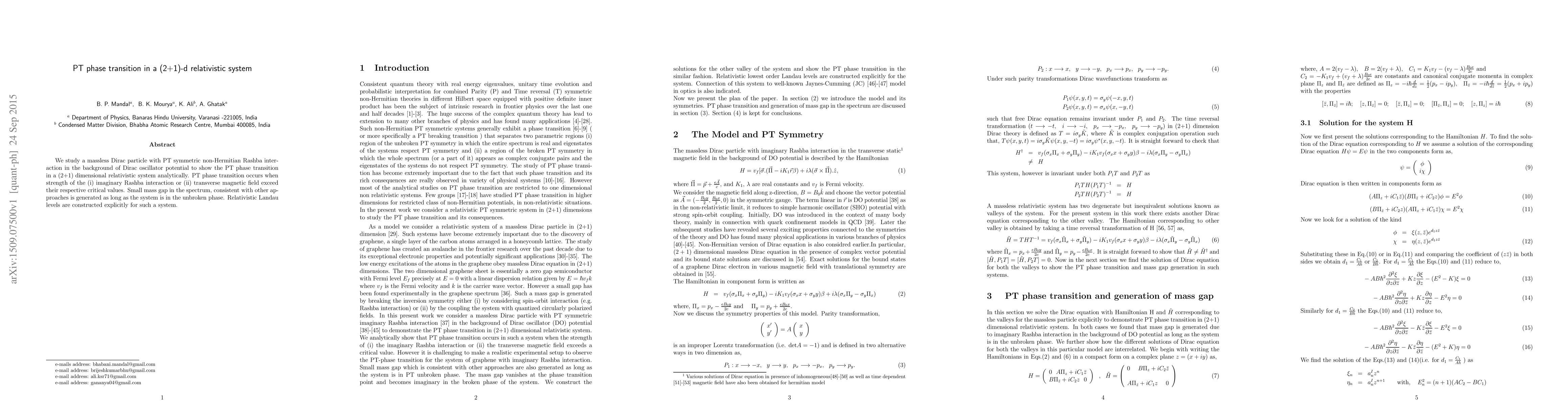 We study a massless Dirac particle with PT symmetric non-Hermitian Rashba interaction in the background of Dirac oscillator potential to show the PT phase transition in a (2+1) dimensional relativistic system analytically. PT phase transition occurs when strength of the (i) imaginary Rashba interaction or (ii) transverse magnetic field exceed their respective critical values. Small mass gap in the spectrum, consistent with other approaches is generated as long as the system is in the unbroken phase. Relativistic Landau levels are constructed explicitly for such a system.