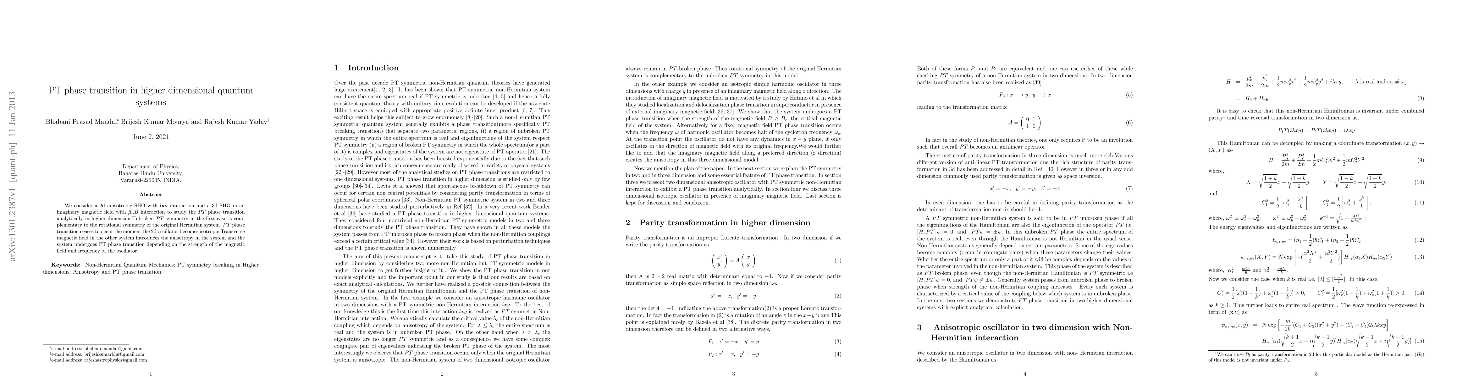 This paper analyzes PT phase transitions in higher-dimensional quantum systems, specifically a 2d anisotropic SHO with an ixy interaction and a 3d SHO in an imaginary magnetic field. The study reveals that PT symmetry in the 2d case complements the rotational symmetry of the Hermitian system, while the 3d system undergoes PT phase transitions influenced by the magnetic field strength and oscillator frequency.