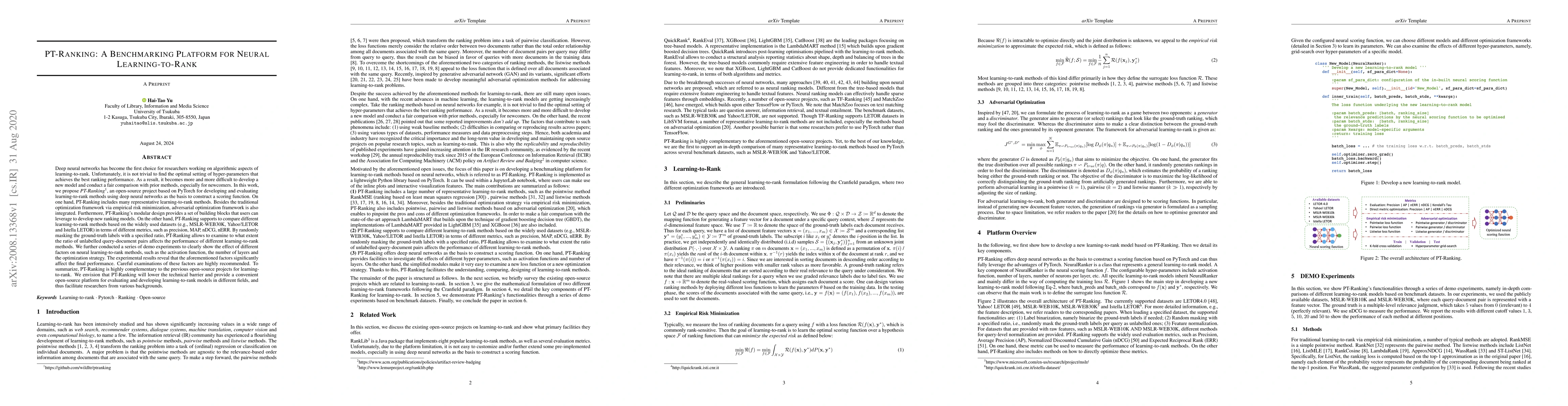 PT-Ranking is an open-source benchmarking platform built on PyTorch for developing and evaluating neural learning-to-rank methods, offering a modular design and comprehensive comparison across various metrics and datasets. It facilitates fair model comparisons and explores the impact of hyperparameters and optimization strategies on ranking performance.