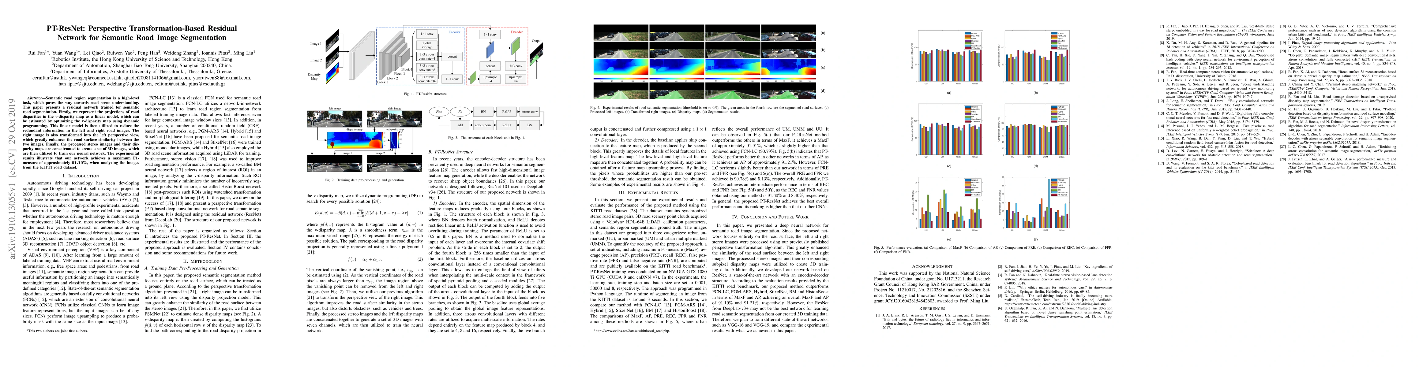 This paper introduces a PT-ResNet for semantic road segmentation using perspective transformation and residual networks. The method optimizes v-disparity maps to reduce redundant information and enhances image similarity through perspective transformation, followed by training on concatenated 3D images, achieving a high F1-measure of 91.19% on the KITTI road dataset.