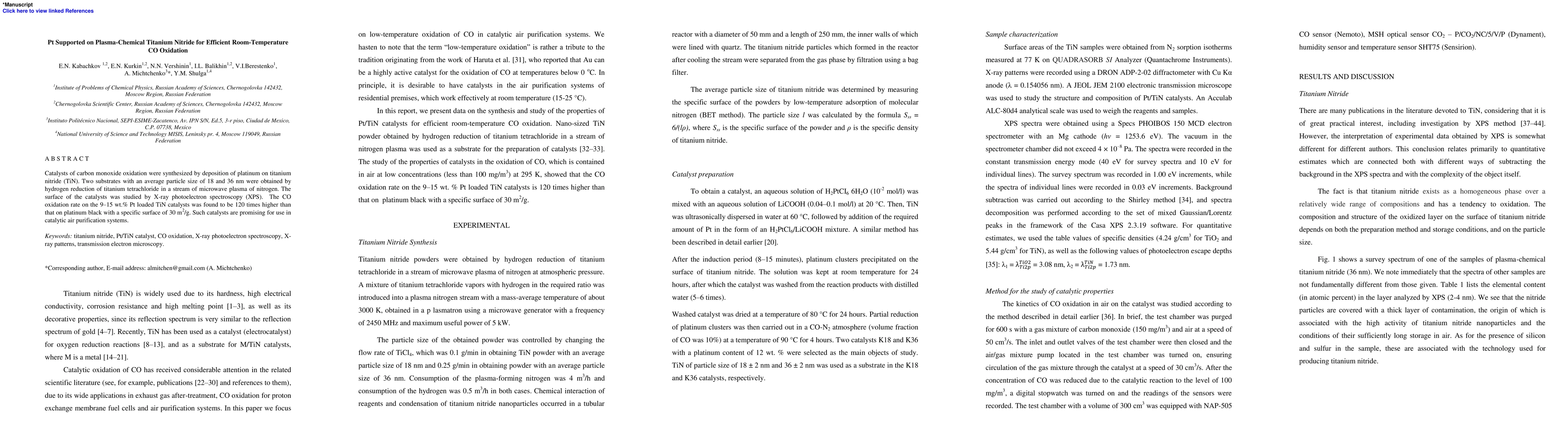 This research synthesizes platinum-supported catalysts on plasma-chemical titanium nitride for efficient room-temperature CO oxidation, achieving a 120-fold higher CO oxidation rate compared to platinum black, indicating potential for catalytic air purification systems.