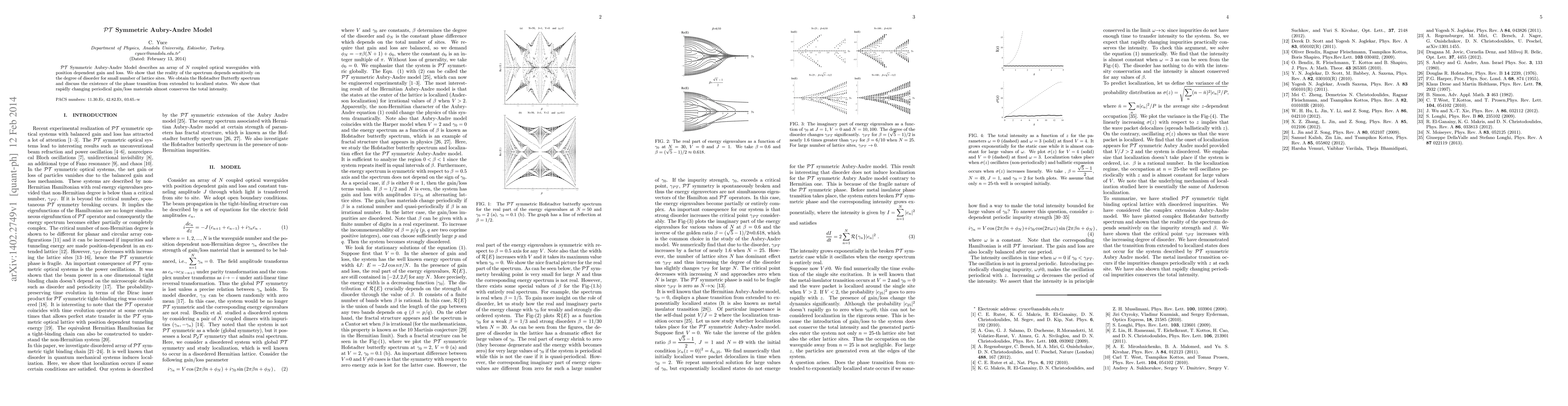 The PT symmetric Aubry-Andre model explores N coupled optical waveguides with position-dependent gain and loss, revealing a spectrum sensitive to disorder degree and exhibiting a phase transition from extended to localized states. The study also demonstrates the conservation of total intensity in rapidly changing periodical gain/loss materials.