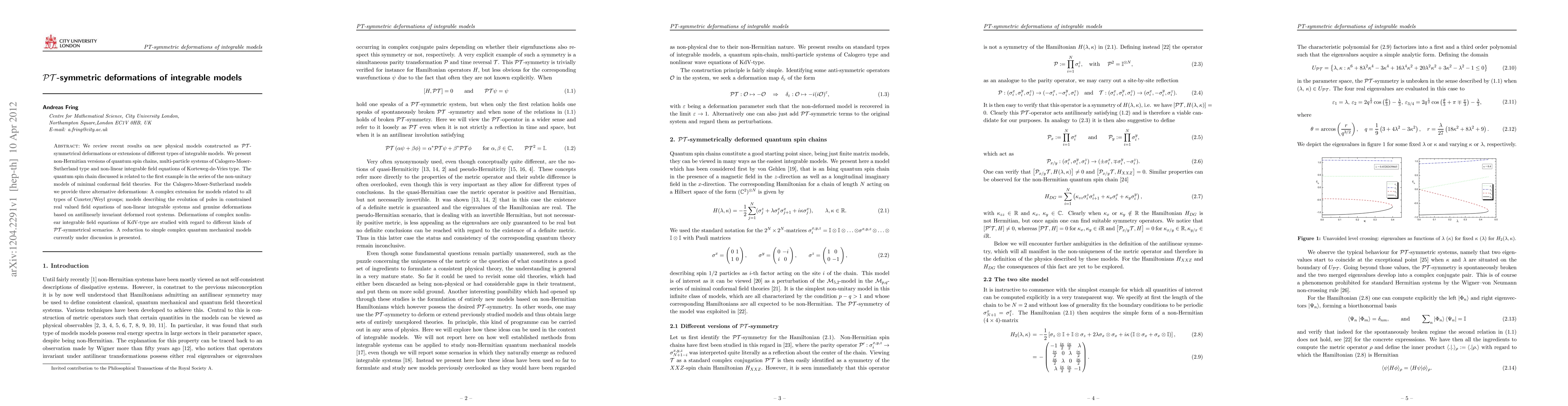 This paper reviews PT-symmetric deformations of various integrable models, including non-Hermitian quantum spin chains, multi-particle Calogero-Moser-Sutherland systems, and PT-symmetric versions of KdV-type field equations, exploring their connections to minimal conformal field theories and providing alternative deformations for these models.