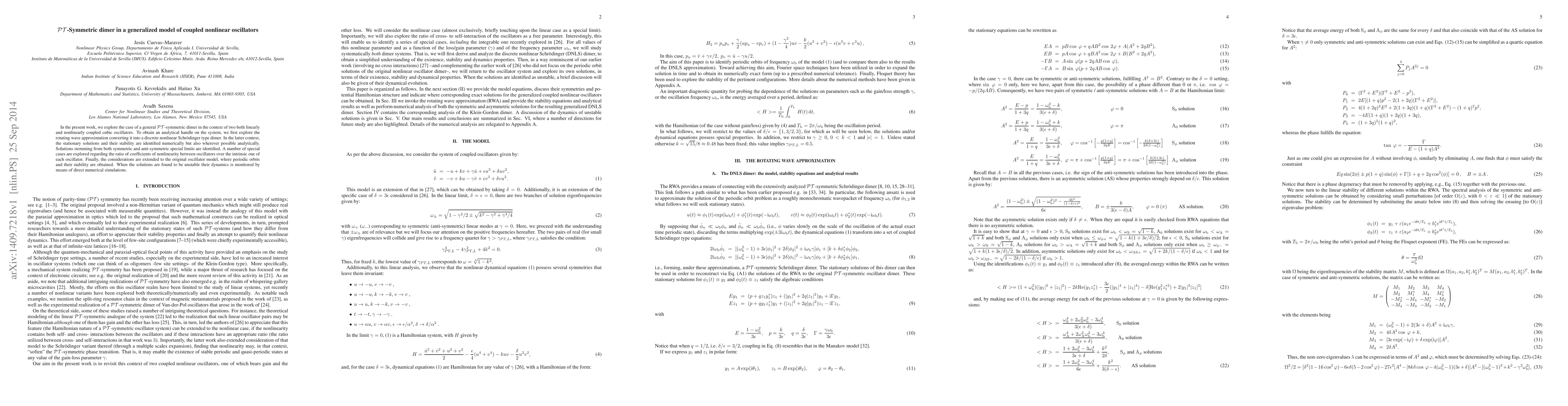 In the present work, we explore the case of a general PT-symmetric dimer in the context of two both linearly and nonlinearly coupled cubic oscillators. To obtain an analytical handle on the system, we first explore the rotating wave approximation converting it into a discrete nonlinear Schr\"odinger type dimer. In the latter context, the stationary solutions and their stability are identified numerically but also wherever possible analytically. Solutions stemming from both symmetric and anti-symmetric special limits are identified. A number of special cases are explored regarding the ratio of coefficients of nonlinearity between oscillators over the intrinsic one of each oscillator. Finally, the considerations are extended to the original oscillator model, where periodic orbits and their stability are obtained. When the solutions are found to be unstable their dynamics is monitored by means of direct numerical simulations.