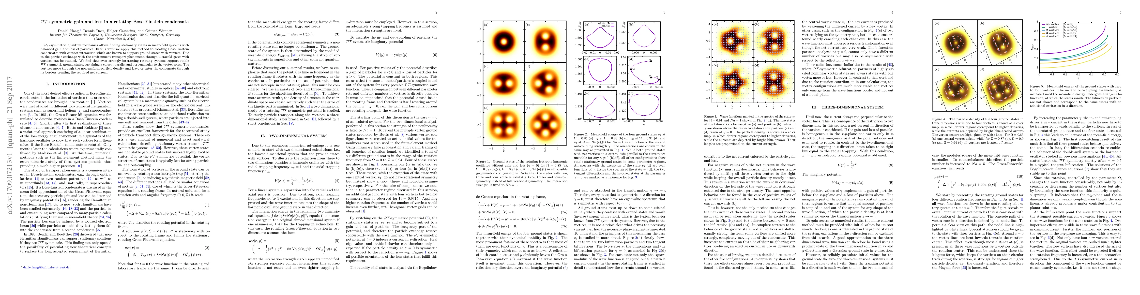 This paper explores PT-symmetric quantum mechanics in rotating Bose-Einstein condensates with balanced particle gain and loss, revealing stable ground states with vortices that support currents parallel and perpendicular to the vortex cores, enabling the study of transport phenomena in ultracold gases.