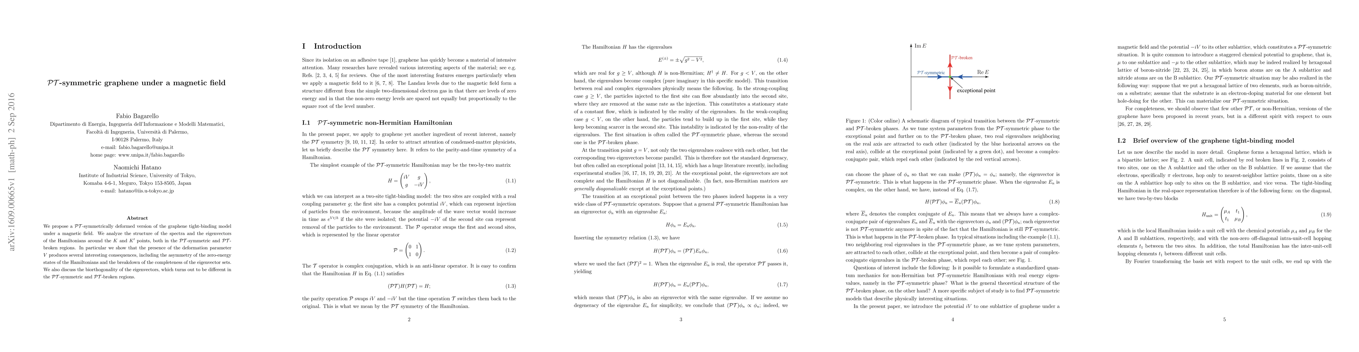 We propose a $PT$-symmetrically deformed version of the graphene tight-binding model under a magnetic field. We analyze the structure of the spectra and the eigenvectors of the Hamiltonians around the $K$ and $K'$ points, both in the $PT$-symmetric and $PT$-broken regions. In particular we show that the presence of the deformation parameter $V$ produces several interesting consequences, including the asymmetry of the zero-energy states of the Hamiltonians and the breakdown of the completeness of the eigenvector sets. We also discuss the biorthogonality of the eigenvectors, which {turns out to be} different in the $PT$-symmetric and $PT$-broken regions.