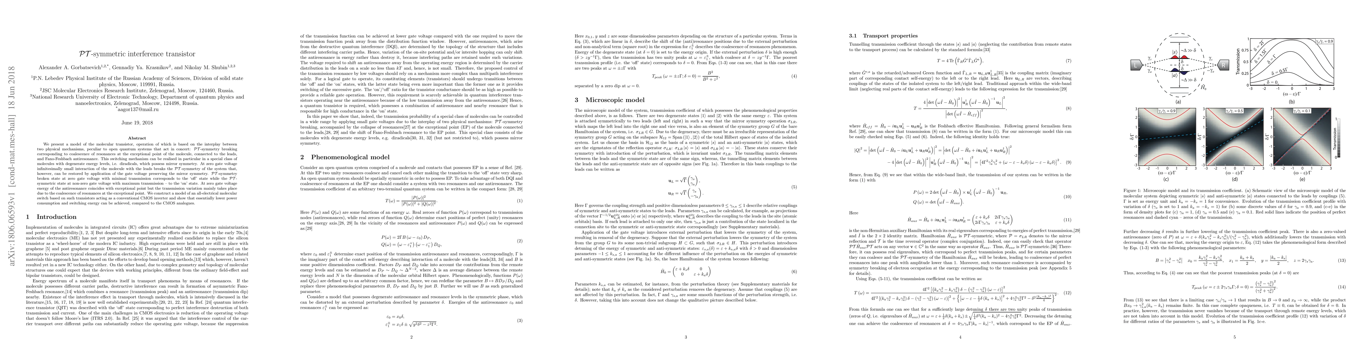 We present a model of the molecular transistor, operation of which is based on the interplay between two physical mechanisms, peculiar to open quantum systems that act in concert: PT-symmetry breaking corresponding to coalescence of resonances at the exceptional point of the molecule, connected to the leads, and Fano-Feshbach antiresonance. This switching mechanism can be realized in particular in a special class of molecules with degenerate energy levels, i.e. diradicals, which possess mirror symmetry. At zero gate voltage infinitesimally small interaction of the molecule with the leads breaks the PT-symmetry of the system that, however, can be restored by application of the gate voltage preserving the mirror symmetry. PT-symmetry broken state at zero gate voltage with minimal transmission corresponds to the 'off' state while the PT-symmetric state at non-zero gate voltage with maximum transmission - to the 'on' state. At zero gate voltage energy of the antiresonance coincides with exceptional point but the transmission variation mainly takes place due to the coalescence of resonances at the exceptional point. We construct a model of an all-electrical molecular switch based on such transistors acting as a conventional CMOS inverter and show that essentially lower power consumption and switching energy can be achieved, compared to the CMOS analogues.