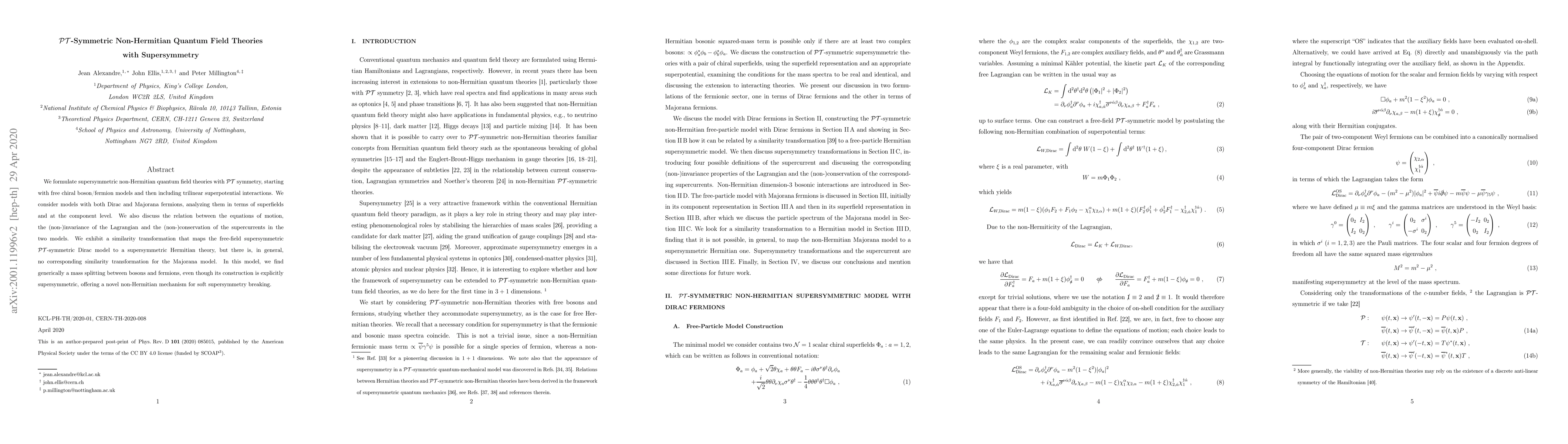 This paper formulates supersymmetric non-Hermitian quantum field theories with PT symmetry, exploring both Dirac and Majorana fermions. It reveals a mass splitting in the Majorana model, suggesting a novel mechanism for soft supersymmetry breaking despite explicit supersymmetry.