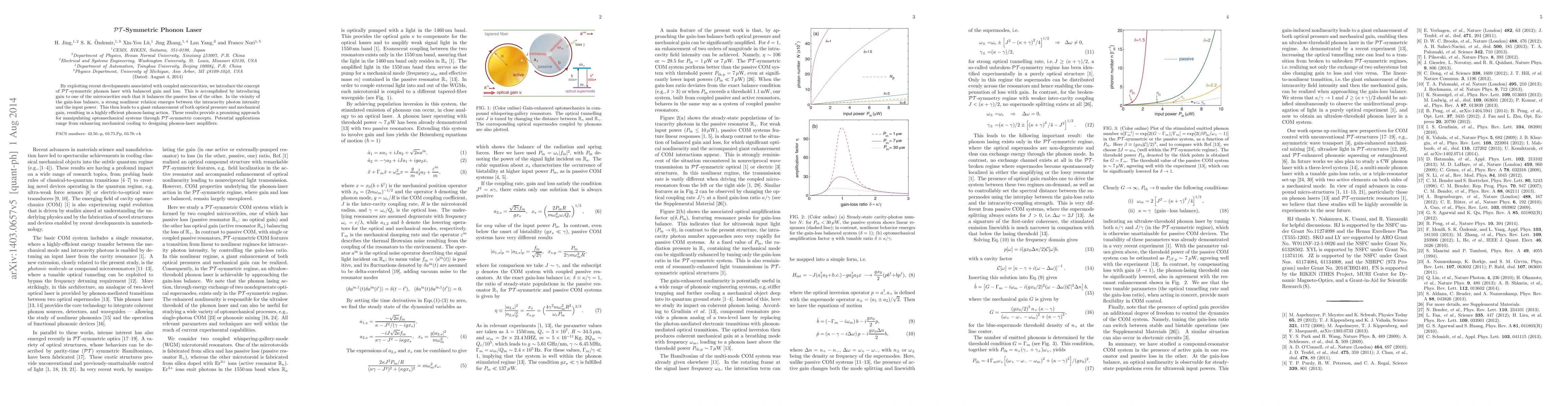 The paper introduces a PT-symmetric phonon laser utilizing coupled microcavities with balanced gain and loss, achieving significant optical pressure and mechanical gain enhancements near gain-loss balance. This approach offers potential applications in mechanical cooling and phonon-laser amplifiers.