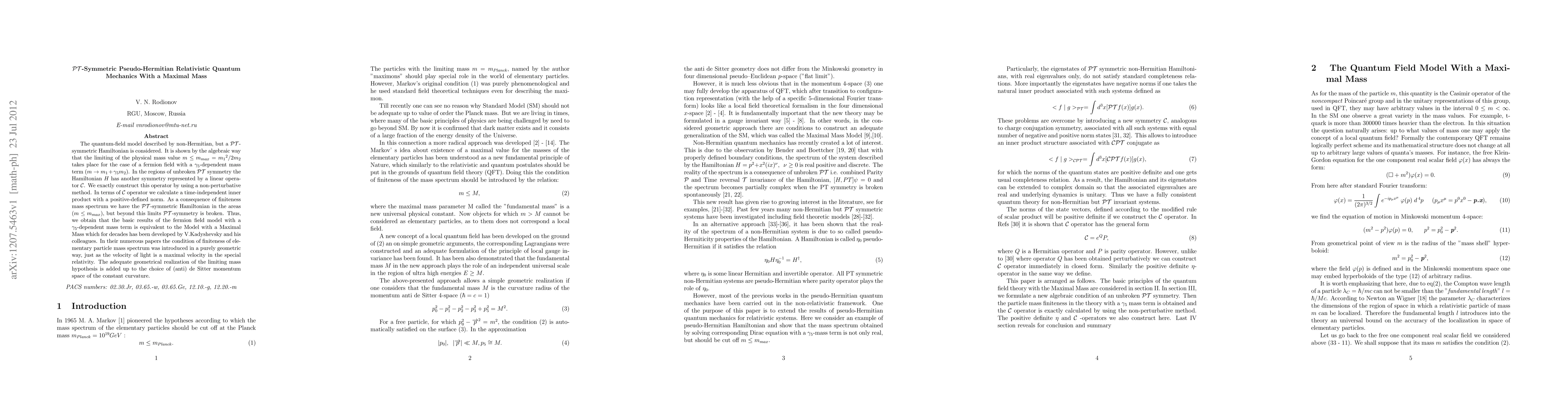 The quantum-field model described by non-Hermitian, but a ${\cal PT}$-symmetric Hamiltonian is considered. It is shown by the algebraic way that the limiting of the physical mass value $m \leq m_{max}= {m_1}^2/2m_2$ takes place for the case of a fermion field with a $\gamma_5$-dependent mass term ($m\rightarrow m_1 +\gamma_5 m_2 $). In the regions of unbroken $\cal PT$ symmetry the Hamiltonian $H$ has another symmetry represented by a linear operator $ \cal C$. We exactly construct this operator by using a non-perturbative method. In terms of $ \cal C$ operator we calculate a time-independent inner product with a positive-defined norm. As a consequence of finiteness mass spectrum we have the $\cal PT$-symmetric Hamiltonian in the areas $(m\leq m_{max})$, but beyond this limits $\cal PT$-symmetry is broken. Thus, we obtain that the basic results of the fermion field model with a $\gamma_5$-dependent mass term is equivalent to the Model with a Maximal Mass which for decades has been developed by V.Kadyshevsky and his colleagues. In their numerous papers the condition of finiteness of elementary particle mass spectrum was introduced in a purely geometric way, just as the velocity of light is a maximal velocity in the special relativity. The adequate geometrical realization of the limiting mass hypothesis is added up to the choice of (anti) de Sitter momentum space of the constant curvature.