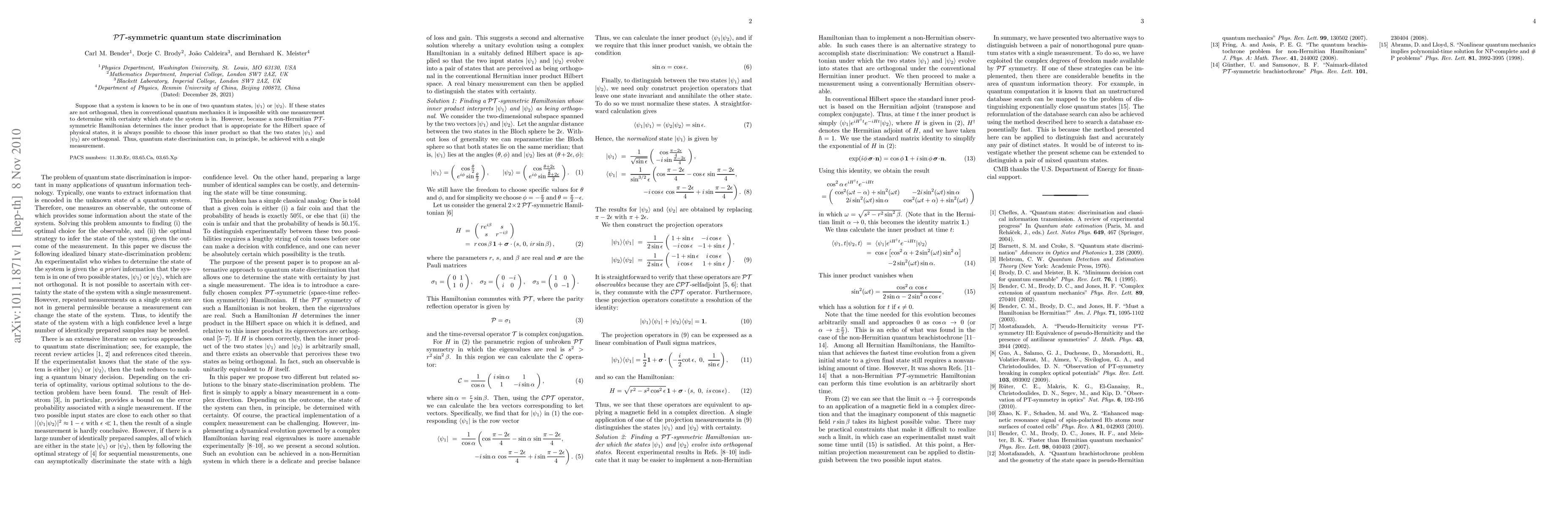 This paper explores how PT-symmetric quantum mechanics allows for unambiguous state discrimination between two non-orthogonal quantum states, $|\psi_1>$ and $|\psi_2>$, by choosing an appropriate inner product determined by a non-Hermitian PT-symmetric Hamiltonian. This method enables single-measurement state identification.