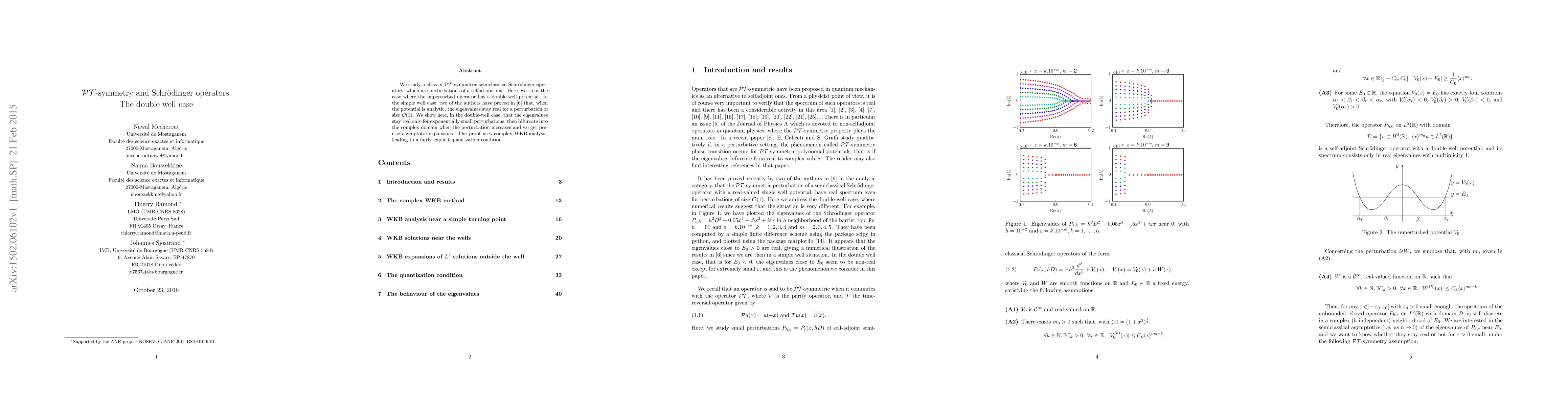 We study a class of PT-symmetric semiclassical Schr\"odinger operators, which are perturbations of a selfadjoint one. Here, we treat the case where the unperturbed operator has a double-well potential. In the simple well case, two of the authors have proved in \cite{BoMe14} that, when the potential is analytic, the eigenvalues stay real for a perturbation of size O(1). We show here, in the double-well case, that the eigenvalues stay real only for exponentially small perturbations, then bifurcate into the complex domain when the perturbation increases and we get precise asymptotic expansions. The proof uses complex WKB-analysis, leading to a fairly explicit quantization condition.