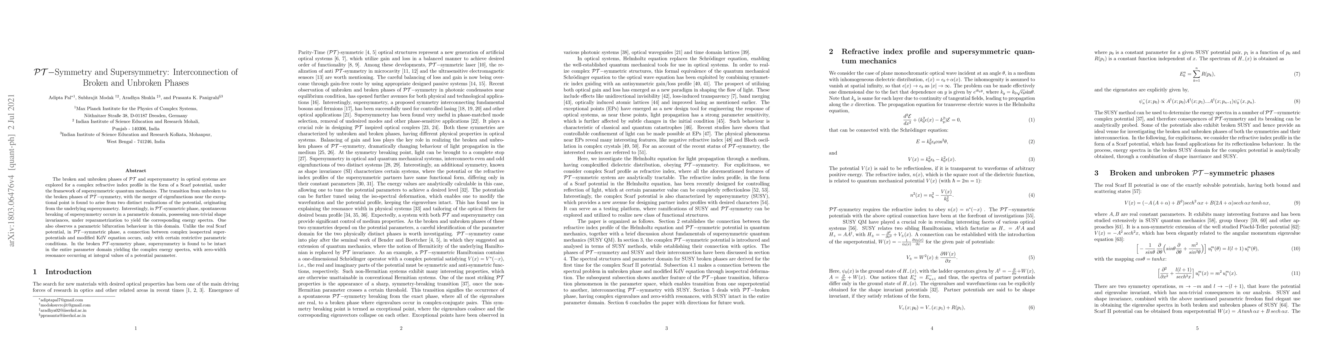 This paper investigates the transition between unbroken and broken PT-symmetry phases in optical systems using a Scarf potential, revealing spontaneous supersymmetry breaking in the PT-symmetric phase and intact supersymmetry in the broken phase, with unique spectral properties and bifurcation behaviors.