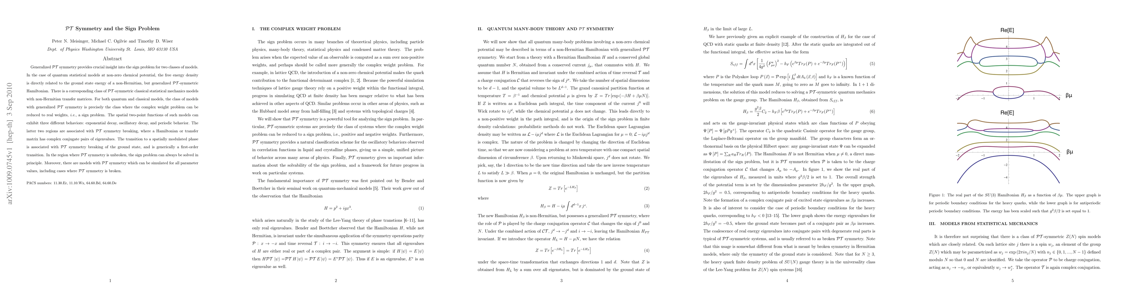 Generalized PT symmetry provides crucial insight into the sign problem for two classes of models. In the case of quantum statistical models at non-zero chemical potential, the free energy density is directly related to the ground state energy of a non-Hermitian, but generalized PT-symmetric Hamiltonian. There is a corresponding class of PT-symmetric classical statistical mechanics models with non-Hermitian transfer matrices. For both quantum and classical models, the class of models with generalized PT symmetry is precisely the class where the complex weight problem can be reduced to real weights, i.e., a sign problem. The spatial two-point functions of such models can exhibit three different behaviors: exponential decay, oscillatory decay, and periodic behavior. The latter two regions are associated with PT symmetry breaking, where a Hamiltonian or transfer matrix has complex conjugate pairs of eigenvalues. The transition to a spatially modulated phase is associated with PT symmetry breaking of the ground state, and is generically a first-order transition. In the region where PT symmetry is unbroken, the sign problem can always be solved in principle. Moreover, there are models with PT symmetry which can be simulated for all parameter values, including cases where PT symmetry is broken.