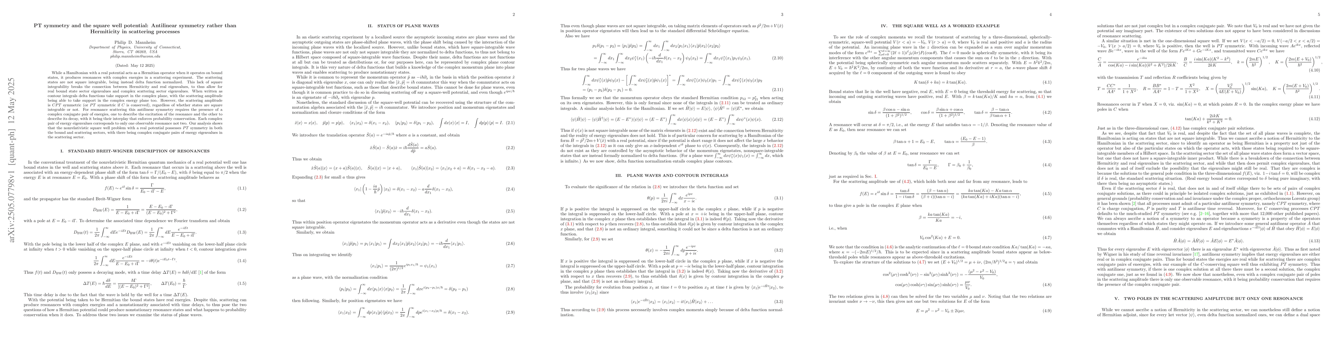 The paper demonstrates that PT symmetry holds in the scattering sector of the square well potential, even for non-square integrable states, reinforcing the role of antilinear symmetry in scattering processes.