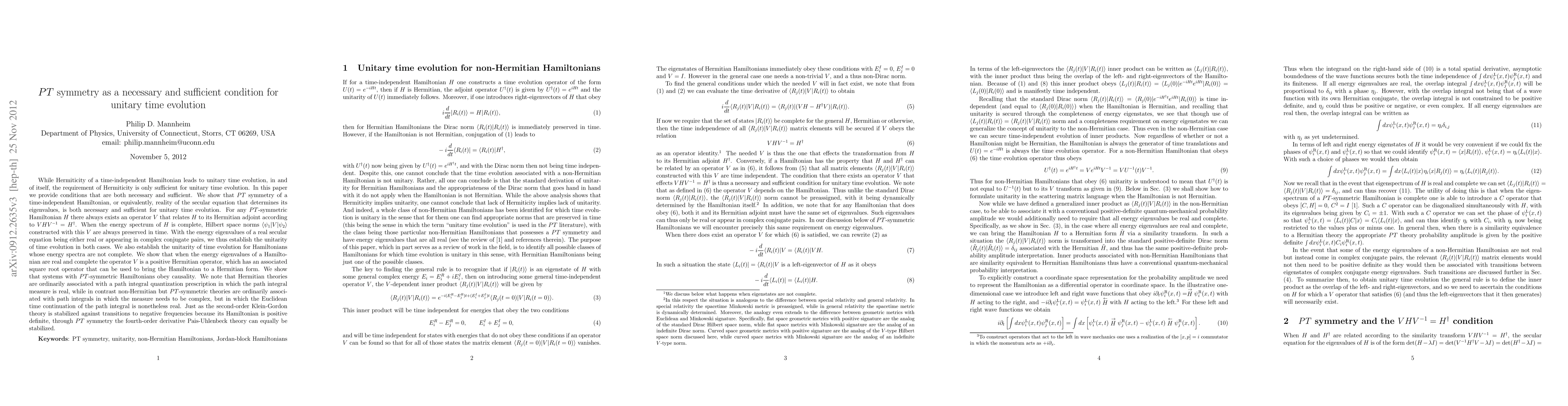 This paper establishes that $PT$ symmetry is a necessary and sufficient condition for unitary time evolution, providing a framework where $PT$-symmetric Hamiltonians maintain the unitarity of time evolution even when their spectra are not entirely real. It also discusses the role of an operator $V$ in relating $PT$-symmetric Hamiltonians to their Hermitian adjoints and highlights the implications for causality and path integral quantization.
