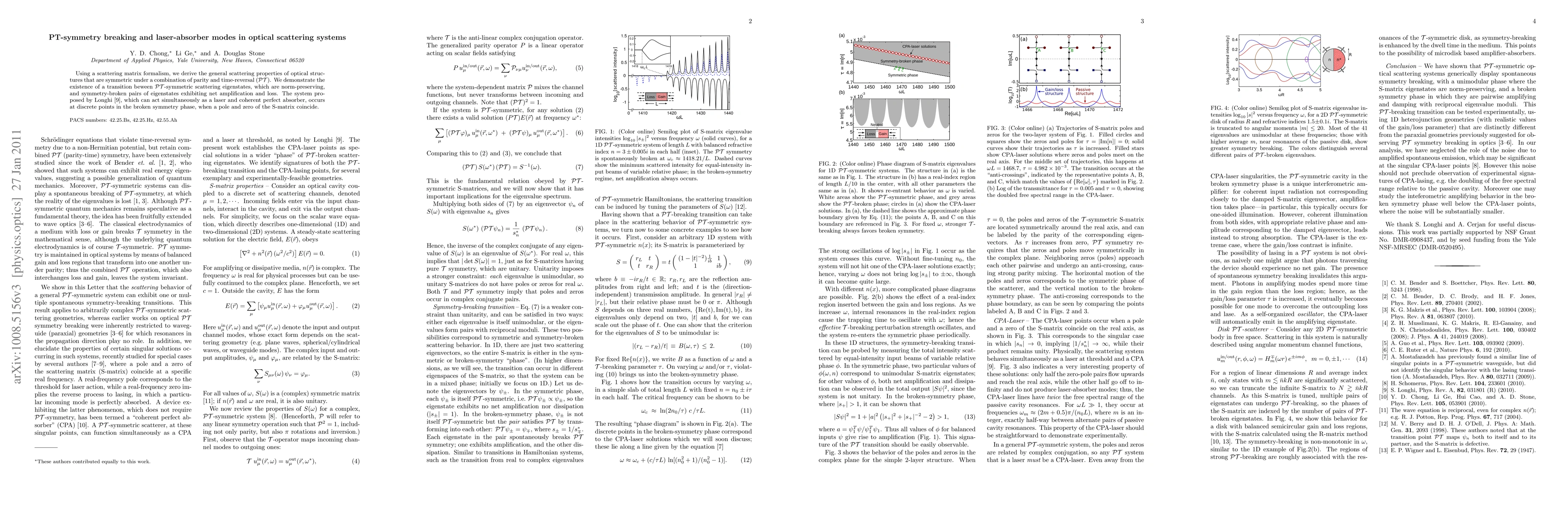 Using a scattering matrix formalism, we derive the general scattering properties of optical structures that are symmetric under a combination of parity and time-reversal (PT). We demonstrate the existence of a transition beween PT-symmetric scattering eigenstates, which are norm-preserving, and symmetry-broken pairs of eigenstates exhibiting net amplification and loss. The system proposed by Longhi, which can act simultaneously as a laser and coherent perfect absorber, occurs at discrete points in the broken symmetry phase, when a pole and zero of the S-matrix coincide.