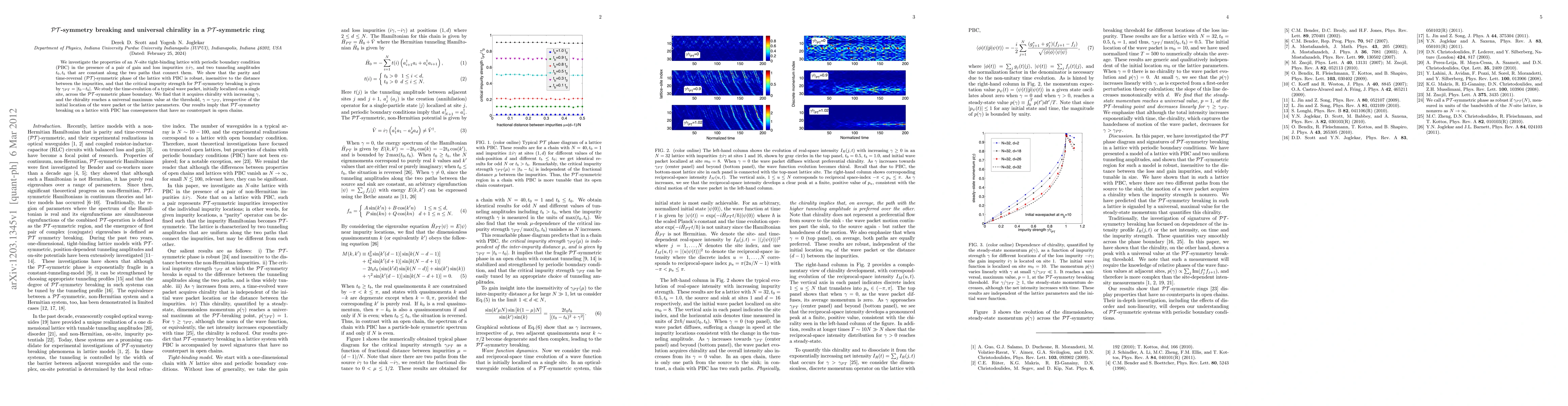 This paper explores an $N$-site tight-binding lattice with periodic boundary conditions and gain/loss impurities, demonstrating robust PT-symmetric phase and universal chirality upon PT-symmetry breaking, with critical strength $\gamma_{PT}=|t_0-t_b|$. Chirality of wave packets reaches a universal maximum at the PT-symmetry breaking threshold, irrespective of initial conditions.