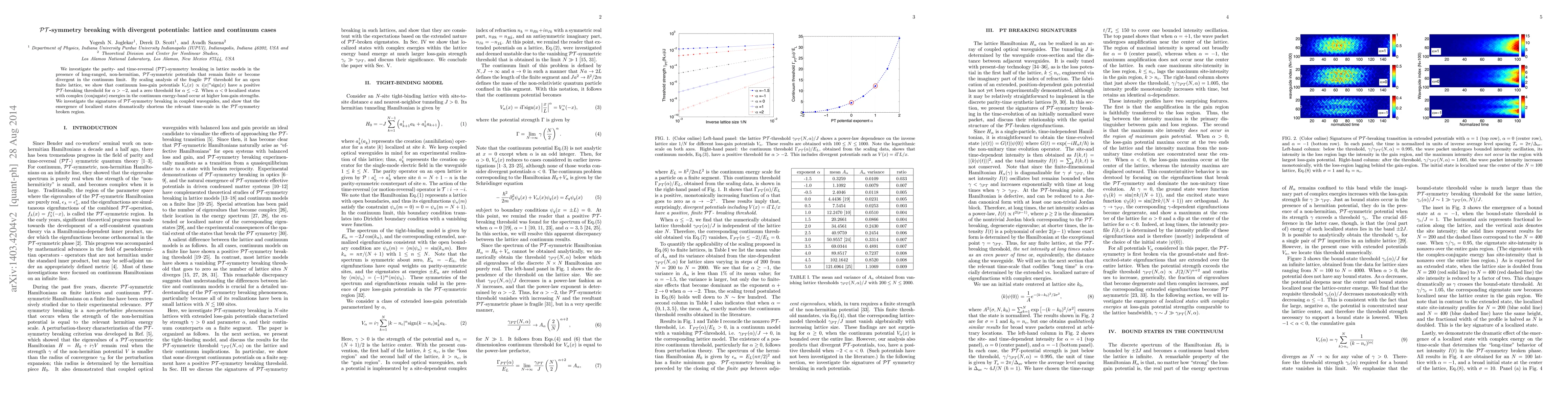 We investigate the parity- and time-reversal ($\mathcal{PT}$)-symmetry breaking in lattice models in the presence of long-ranged, non-hermitian, $\mathcal{PT}$-symmetric potentials that remain finite or become divergent in the continuum limit. By scaling analysis of the fragile $\mathcal{PT}$ threshold for an open finite lattice, we show that continuum loss-gain potentials $V_\alpha(x)\propto i |x|^\alpha \mathrm{sign}(x)$ have a positive $\mathcal{PT}$-breaking threshold for $\alpha>-2$, and a zero threshold for $\alpha\leq -2$. When $\alpha<0$ localized states with complex (conjugate) energies in the continuum energy-band occur at higher loss-gain strengths. We investigate the signatures of $\mathcal{PT}$-symmetry breaking in coupled waveguides, and show that the emergence of localized states dramatically shortens the relevant time-scale in the $\mathcal{PT}$-symmetry broken region.