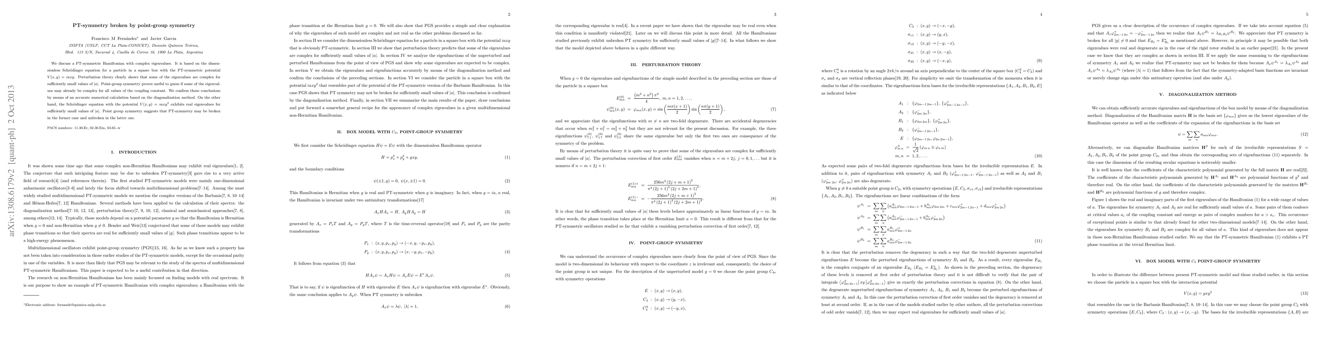 We discuss a PT-symmetric Hamiltonian with complex eigenvalues. It is based on the dimensionless Schr\"{o}dinger equation for a particle in a square box with the PT-symmetric potential $V(x,y)=iaxy$. Perturbation theory clearly shows that some of the eigenvalues are complex for sufficiently small values of $|a|$. Point-group symmetry proves useful to guess if some of the eigenvalues may already be complex for all values of the coupling constant. We confirm those conclusions by means of an accurate numerical calculation based on the diagonalization method. On the other hand, the Schr\"odinger equation with the potential $V(x,y)=iaxy^{2}$ exhibits real eigenvalues for sufficiently small values of $|a|$. Point group symmetry suggests that PT-symmetry may be broken in the former case and unbroken in the latter one.