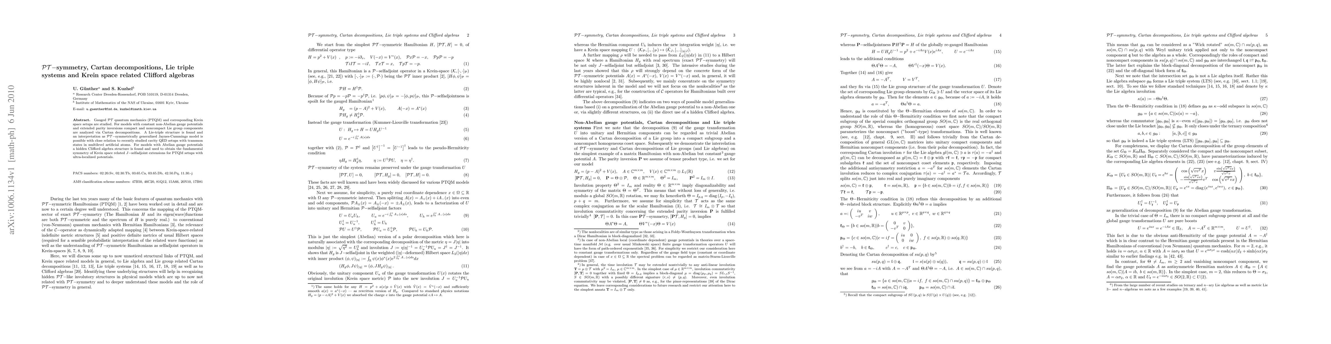 The paper explores PT-symmetric quantum mechanics (PTQM) with gauge potentials, utilizing Cartan decompositions to analyze compact and noncompact Lie group components. A Lie triple system is discovered, allowing for a PT-symmetric generalization of the Jaynes-Cummings model. For Abelian gauge potentials, a hidden Clifford algebra structure is identified, leading to symmetries in Krein space extensions for PTQM setups with ultra-localized potentials.