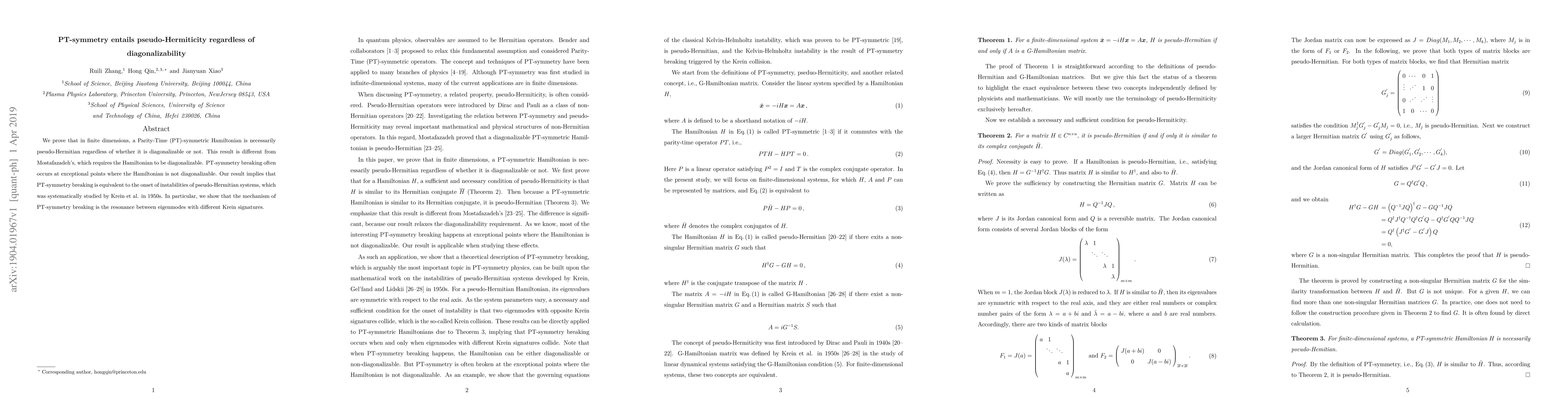 We prove that in finite dimensions, a Parity-Time (PT)-symmetric Hamiltonian is necessarily pseudo-Hermitian regardless of whether it is diagonalizable or not. This result is different from Mostafazadeh's, which requires the Hamiltonian to be diagonalizable. PT-symmetry breaking often occurs at exceptional points where the Hamiltonian is not diagonalizable. Our result implies that PT-symmetry breaking is equivalent to the onset of instabilities of pseudo-Hermitian systems, which was systematically studied by Krein et al. in 1950s. In particular, we show that the mechanism of PT-symmetry breaking is the resonance between eigenmodes with different Krein signatures.