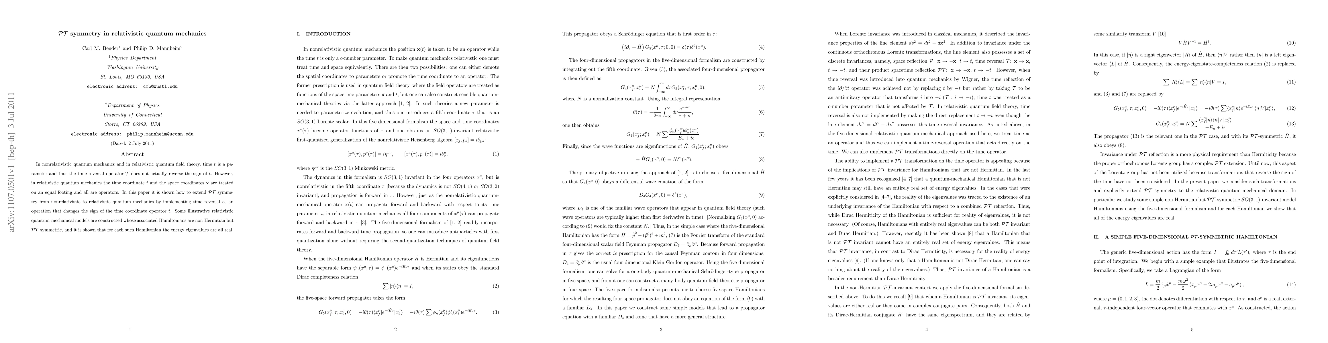 This paper extends PT symmetry from nonrelativistic to relativistic quantum mechanics by treating time as an operator, allowing time reversal to change the sign of t. It constructs relativistic quantum models with non-Hermitian but PT symmetric Hamiltonians, demonstrating that these models maintain real energy eigenvalues.