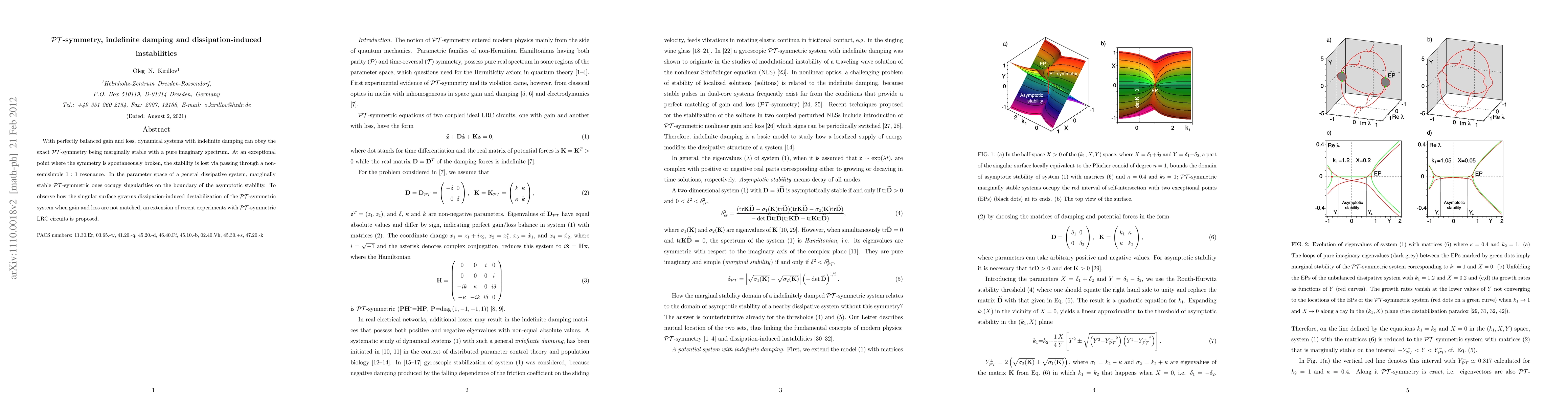 With perfectly balanced gain and loss, dynamical systems with indefinite damping can obey the exact PT-symmetry being marginally stable with a pure imaginary spectrum. At an exceptional point where the symmetry is spontaneously broken, the stability is lost via passing through a non-semisimple 1:1 resonance. In the parameter space of a general dissipative system, marginally stable PT-symmetric ones occupy singularities on the boundary of the asymptotic stability. To observe how the singular surface governs dissipation-induced destabilization of the PT-symmetric system when gain and loss are not matched, an extension of recent experiments with PT-symmetric LRC circuits is proposed.