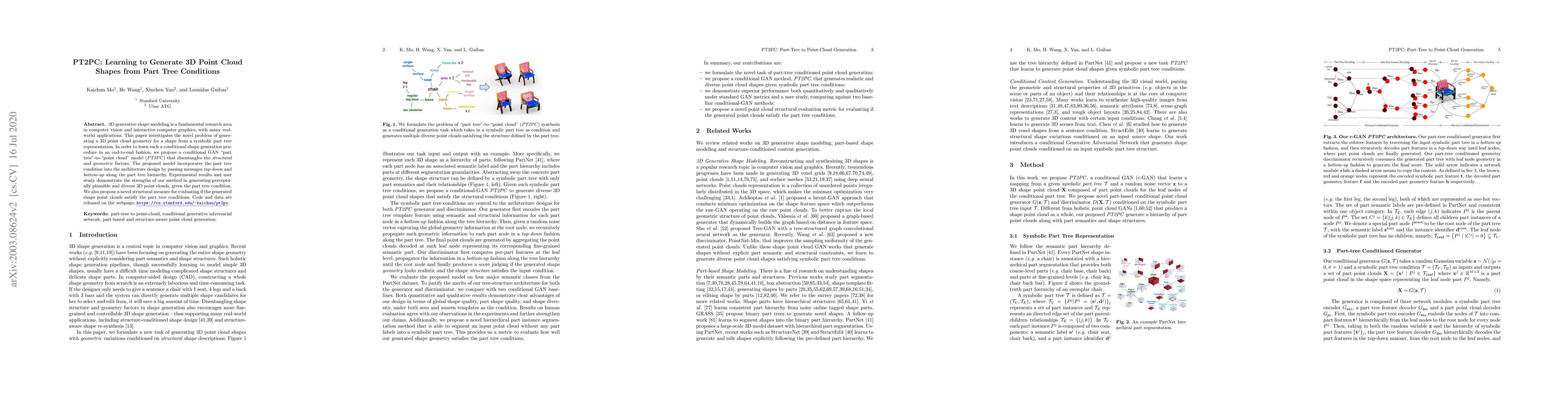 3D generative shape modeling is a fundamental research area in computer vision and interactive computer graphics, with many real-world applications. This paper investigates the novel problem of generating 3D shape point cloud geometry from a symbolic part tree representation. In order to learn such a conditional shape generation procedure in an end-to-end fashion, we propose a conditional GAN "part tree"-to-"point cloud" model (PT2PC) that disentangles the structural and geometric factors. The proposed model incorporates the part tree condition into the architecture design by passing messages top-down and bottom-up along the part tree hierarchy. Experimental results and user study demonstrate the strengths of our method in generating perceptually plausible and diverse 3D point clouds, given the part tree condition. We also propose a novel structural measure for evaluating if the generated shape point clouds satisfy the part tree conditions.