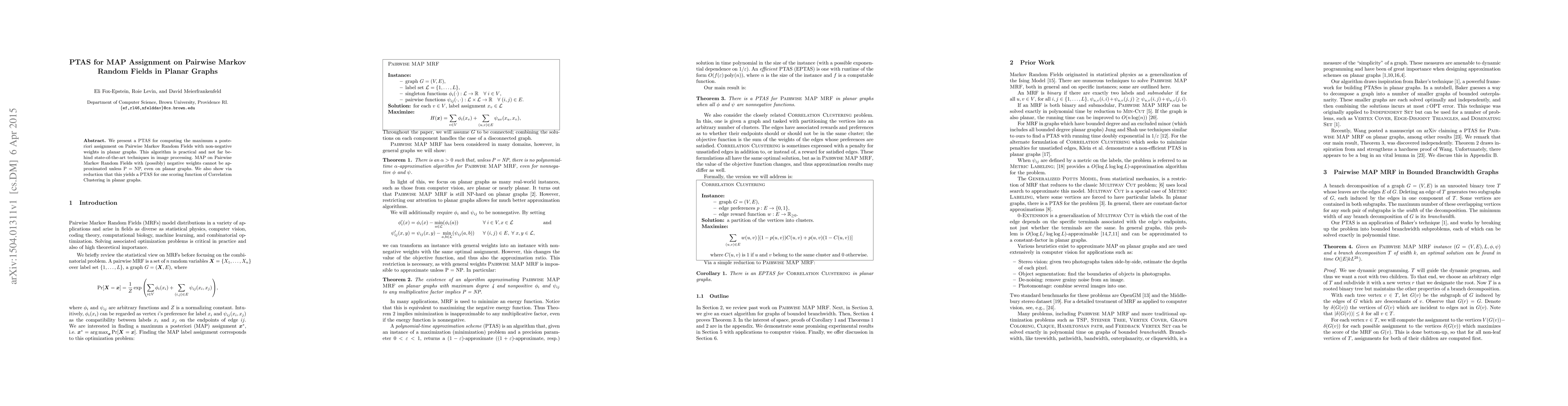 Summary: This paper introduces a Polynomial Time Approximation Scheme (PTAS) for computing the maximum a posteriori assignment in pairwise Markov Random Fields with non-negative weights in planar graphs, achieving practical results. It also demonstrates that MAP assignment with negative weights is NP-hard to approximate even in planar graphs.