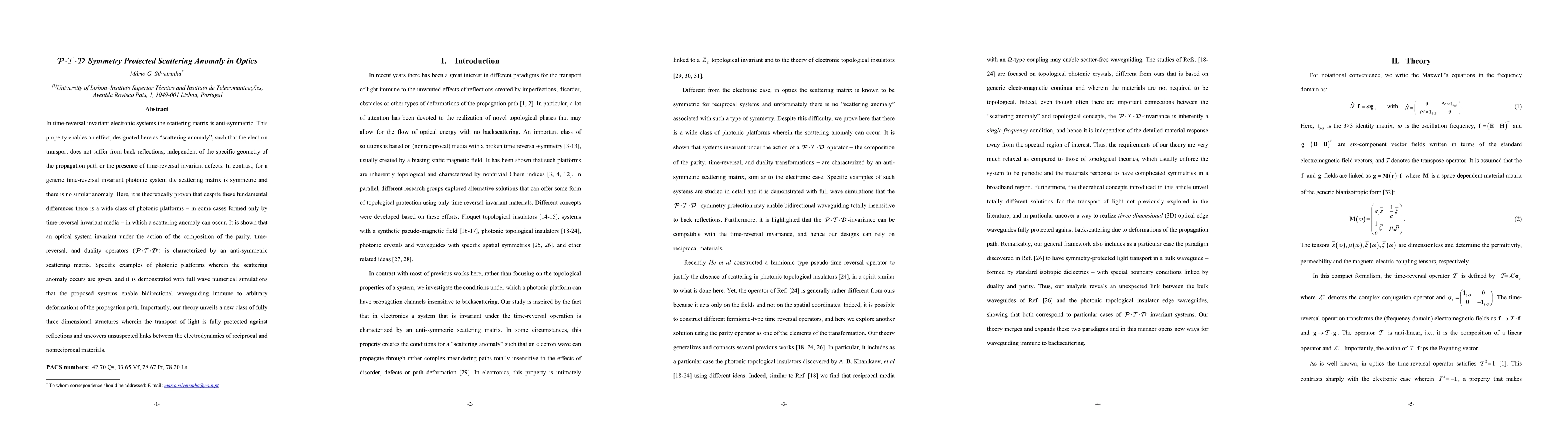 In time-reversal invariant electronic systems the scattering matrix is anti-symmetric. This property enables an effect, designated here as "scattering anomaly", such that the electron transport does not suffer from back reflections, independent of the specific geometry of the propagation path or the presence of time-reversal invariant defects. In contrast, for a generic time-reversal invariant photonic system the scattering matrix is symmetric and there is no similar anomaly. Here, it is theoretically proven that despite these fundamental differences there is a wide class of photonic platforms - in some cases formed only by time-reversal invariant media - in which a scattering anomaly can occur. It is shown that an optical system invariant under the action of the composition of the parity, time-reversal, and duality operators (PTD) is characterized by an anti-symmetric scattering matrix. Specific examples of photonic platforms wherein the scattering anomaly occurs are given, and it is demonstrated with full wave numerical simulations that the proposed systems enable bidirectional waveguiding immune to arbitrary deformations of the propagation path. Importantly, our theory unveils a new class of fully three dimensional structures wherein the transport of light is fully protected against reflections and uncovers unsuspected links between the electrodynamics of reciprocal and nonreciprocal materials.