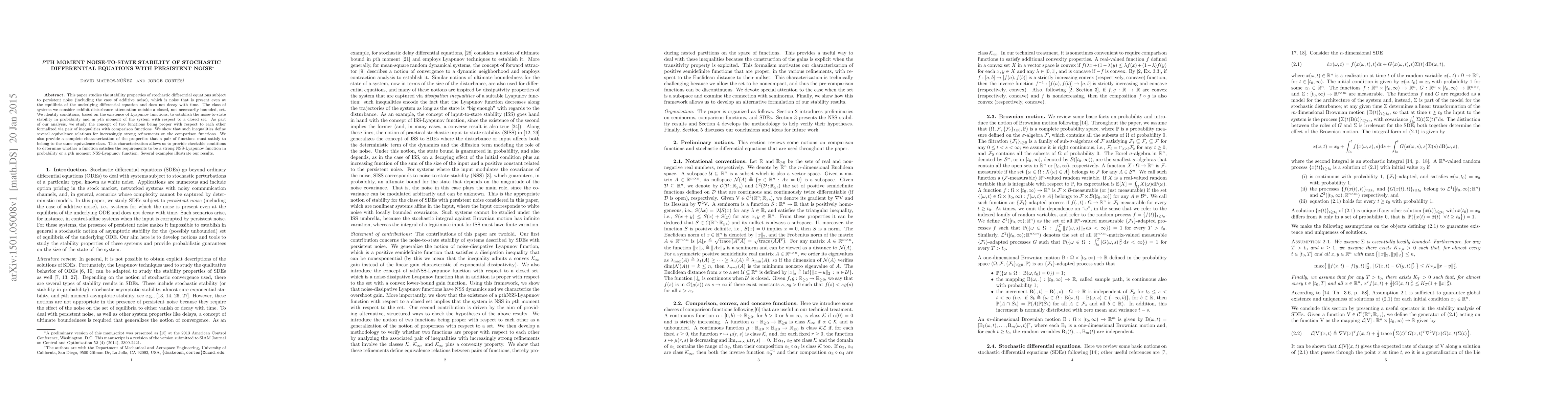 This paper investigates the stability of stochastic differential equations under persistent noise, establishing conditions for noise-to-state stability in probability and pth moment using Lyapunov functions. It also characterizes the properties of functions that define equivalence relations for comparison functions, providing checkable conditions for strong NSS-Lyapunov functions.