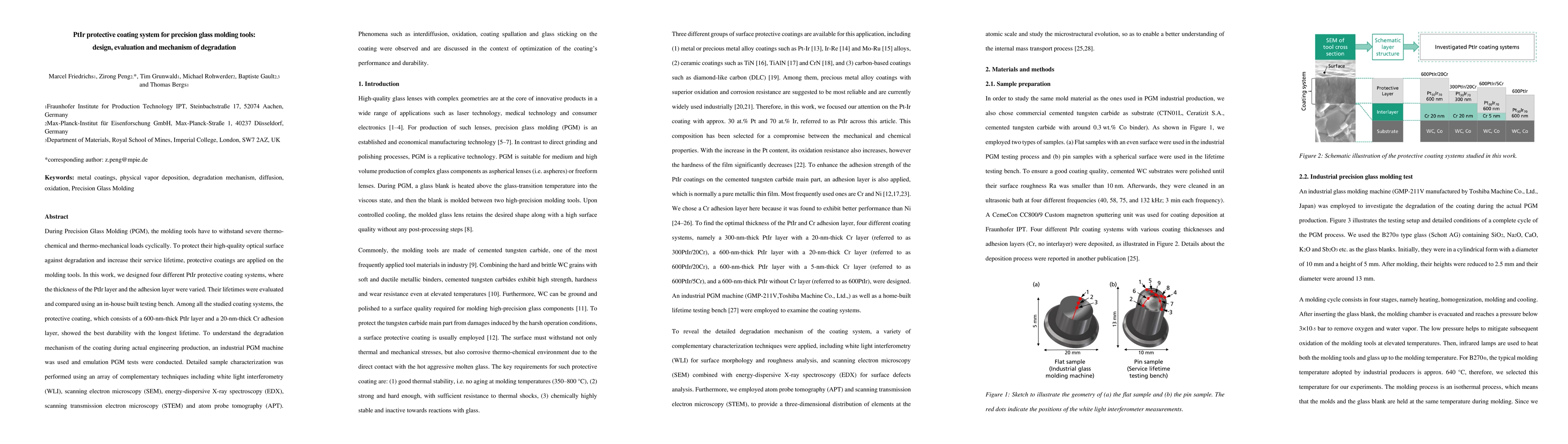 Researchers designed four PtIr coating systems for precision glass molding tools and found that a 600nm thick PtIr layer with a 20nm Cr adhesion layer offered the best durability in cyclic testing. The study also investigated degradation mechanisms using various characterization techniques.