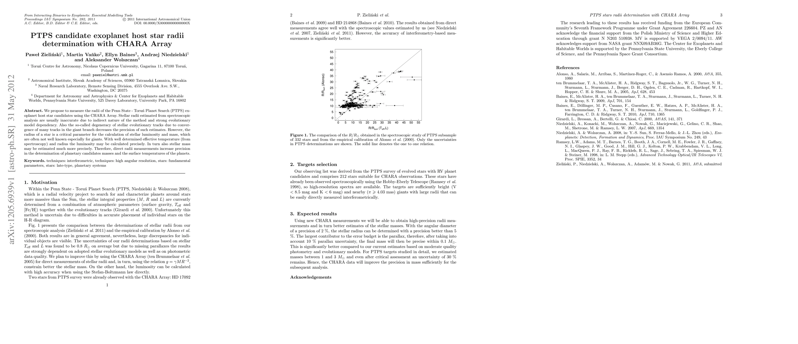 We propose to measure the radii of the Penn State - Torun Planet Search (PTPS) exoplanet host star candidates using the CHARA Array. Stellar radii estimated from spectroscopic analysis are usually inaccurate due to indirect nature of the method and strong evolutionary model dependency. Also the so-called degeneracy of stellar evolutionary tracks due to convergence of many tracks in the giant branch decreases the precision of such estimates. However, the radius of a star is a critical parameter for the calculation of stellar luminosity and mass, which are often not well known especially for giants. With well determined effective temperature (from spectroscopy) and radius the luminosity may be calculated precisely. In turn also stellar mass may be estimated much more precisely. Therefore, direct radii measurements increase precision in the determination of planetary candidates masses and the surface temperatures of the planets.