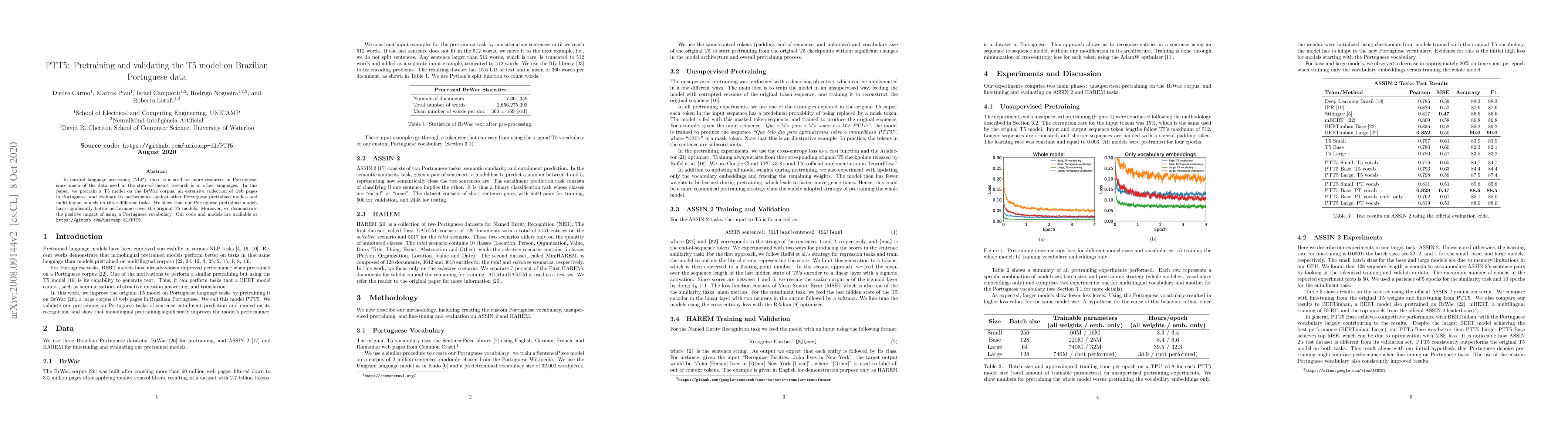 The research pretrains a T5 model on the BrWac corpus, an extensive collection of web pages in Portuguese, and evaluates its performance against other Portuguese pretrained models and multilingual models on three different tasks.