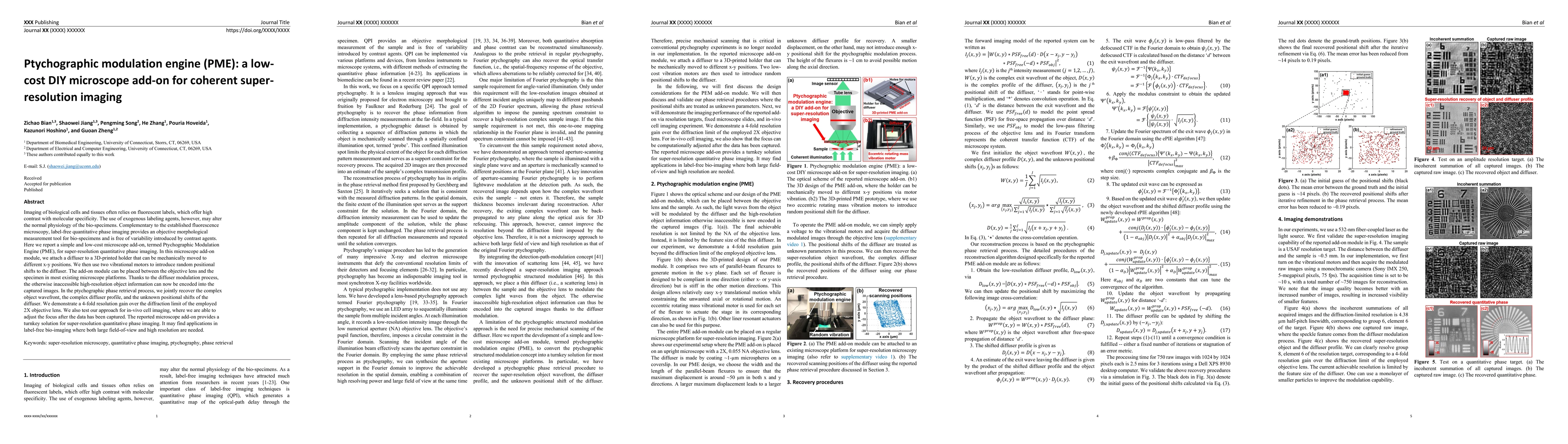 The Ptychographic Modulation Engine (PME) is a low-cost DIY microscope add-on for achieving super-resolution quantitative phase imaging without fluorescent labels. It employs a diffuser and vibrational motors to introduce random shifts, enabling a 4-fold resolution gain over the diffraction limit, suitable for label-free bio-imaging.