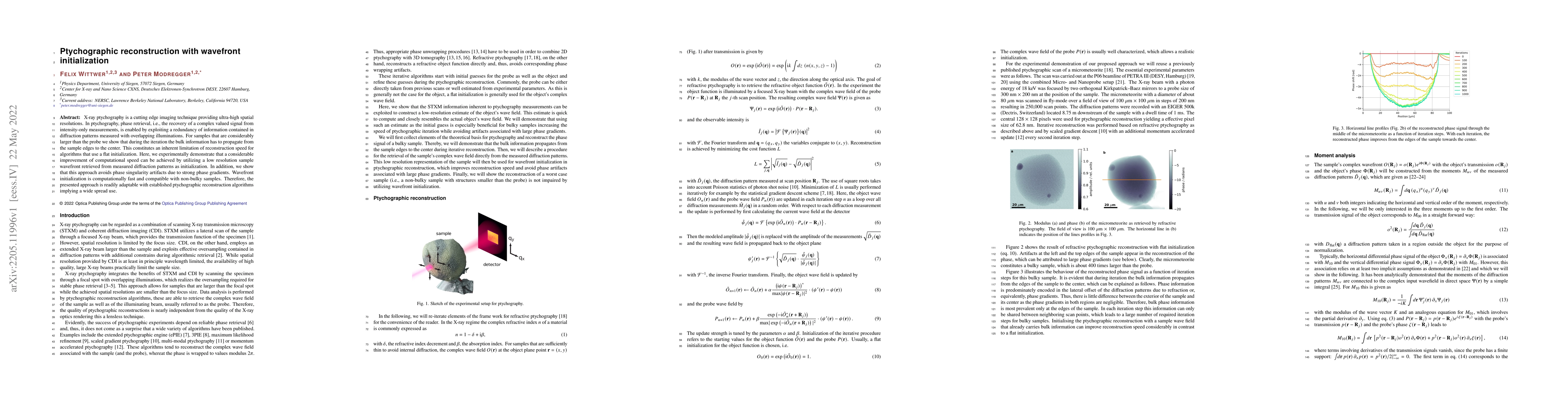 This paper demonstrates that wavefront initialization significantly improves the computational speed of ptychographic reconstruction, especially for large samples, by avoiding phase singularity artifacts and reducing the need for bulk information propagation from sample edges to the center. This method is fast and compatible with non-bulky samples, making it widely applicable to existing ptychographic algorithms.