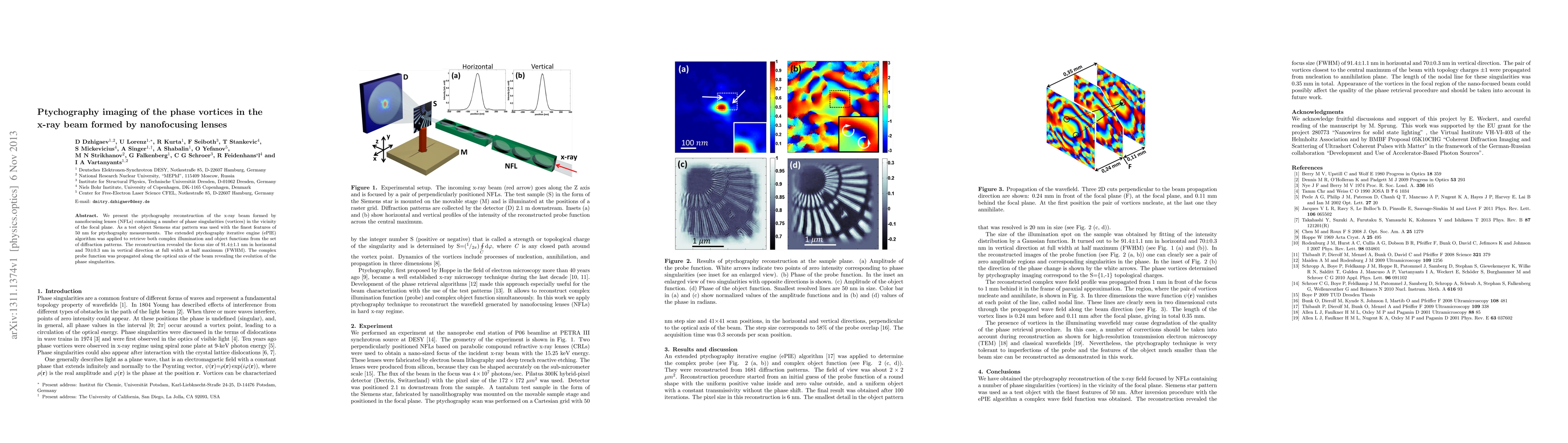 We present the ptychography reconstruction of the x-ray beam formed by nanofocusing lenses (NFLs) containing a number of phase singularities (vortices) in the vicinity of the focal plane. As a test object Siemens star pattern was used with the finest features of 50 nm for ptychography measurements. The extended ptychography iterative engine (ePIE) algorithm was applied to retrieve both complex illumination and object functions from the set of diffraction patterns. The reconstruction revealed the focus size of 91.4$\pm$1.1 nm in horizontal and 70$\pm$0.3 nm in vertical direction at full width at half maximum (FWHM). The complex probe function was propagated along the optical axis of the beam revealing the evolution of the phase singularities.