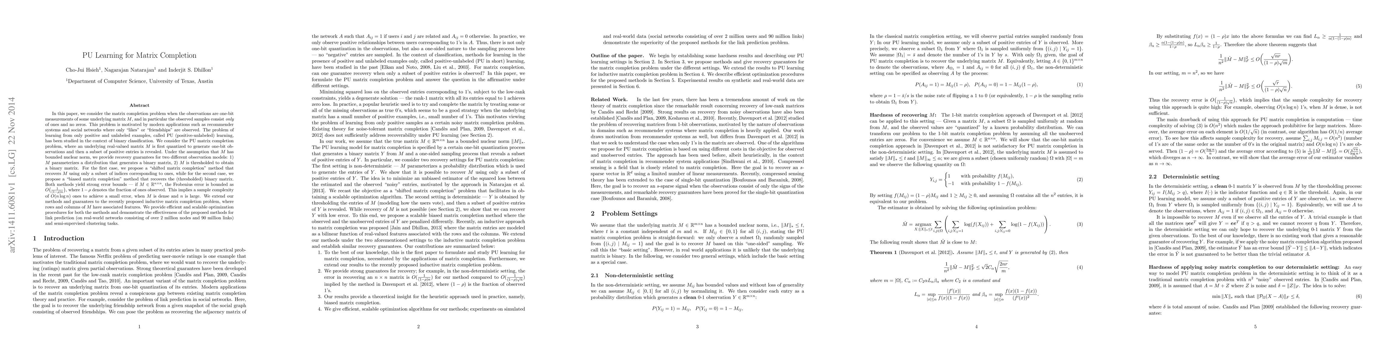 This paper addresses the matrix completion problem using positive-unlabeled (PU) learning when observations are one-bit measurements consisting only of ones. It proposes shifted and biased matrix completion methods for two observation models, providing recovery guarantees and demonstrating effectiveness for link prediction and semi-supervised clustering in large networks.