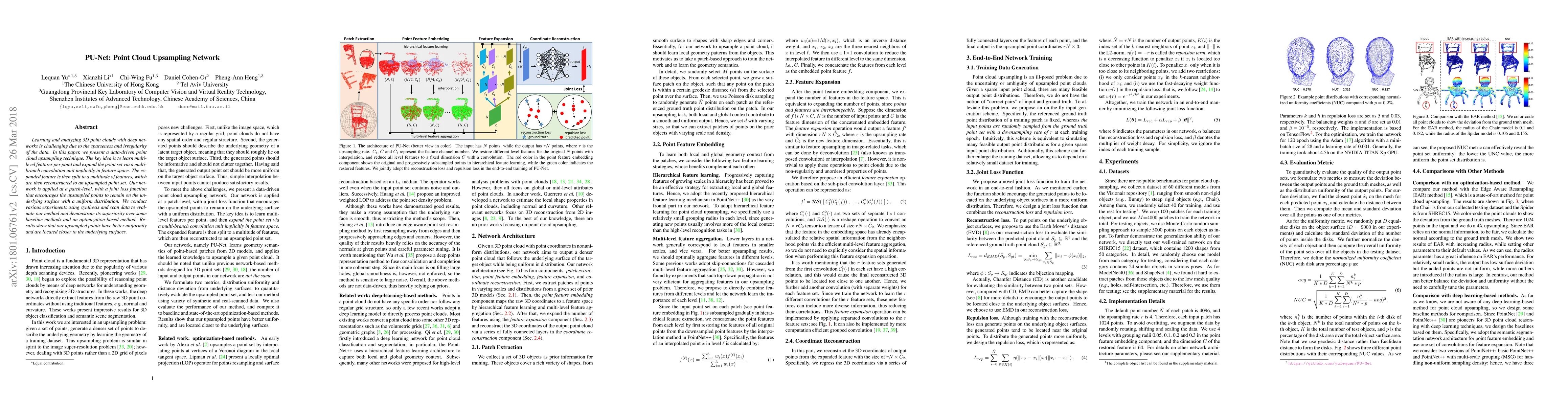 A new point cloud upsampling technique called PU-Net learns to expand 3D points in a way that maintains their distance from the underlying surface, producing more uniform results.