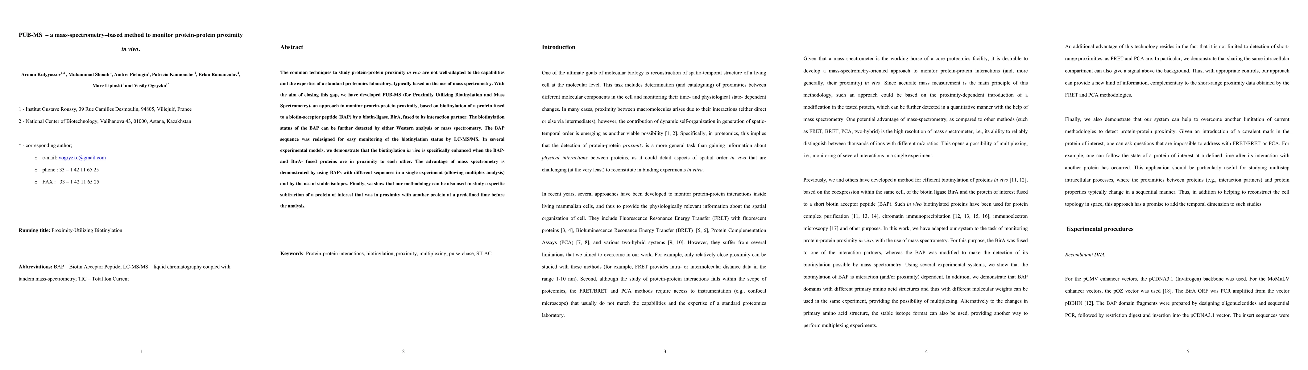 PUB-MS is a novel mass-spectrometry-based method for monitoring protein-protein proximity in vivo by using biotinylation and mass spectrometry. It allows multiplex analysis and stable isotope use, demonstrating its utility in studying protein interactions in various experimental models.