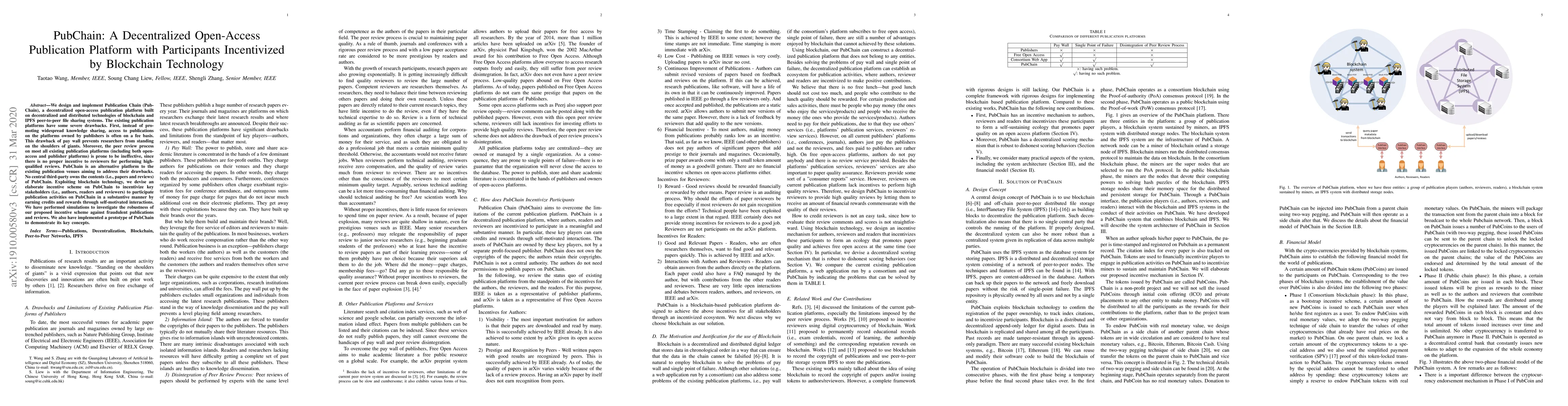 PubChain is a decentralized open-access publication platform leveraging blockchain and IPFS to eliminate paywalls and incentivize high-quality peer reviews. It aims to promote knowledge sharing and effective review processes through a credit-based reward system for participants.