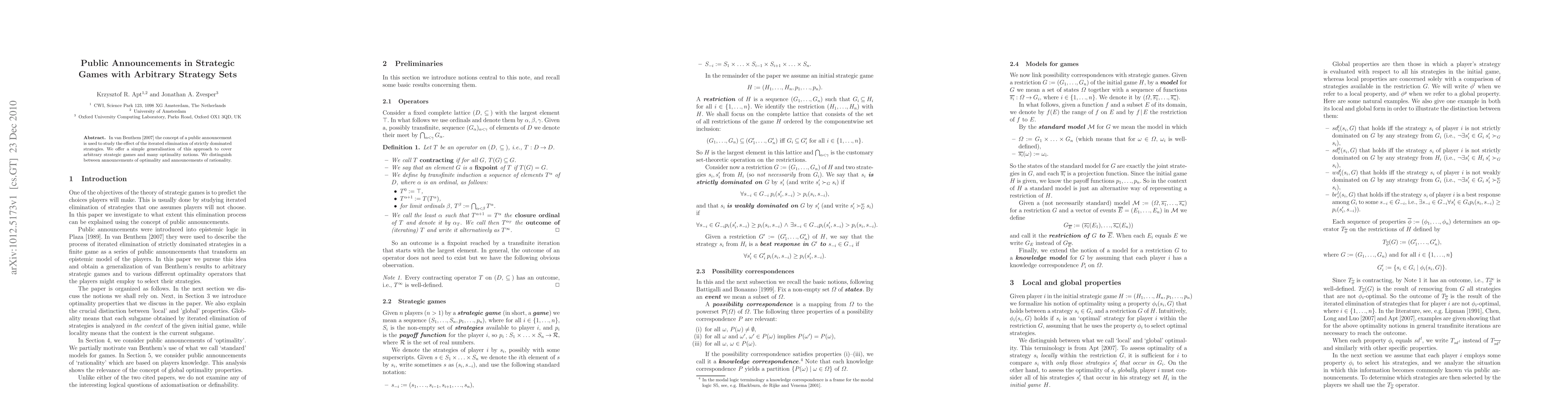 Summary: This paper generalizes the concept of public announcements to analyze strategic games with arbitrary strategy sets, distinguishing between announcements of optimality and rationality to study iterated elimination of strictly dominated strategies.