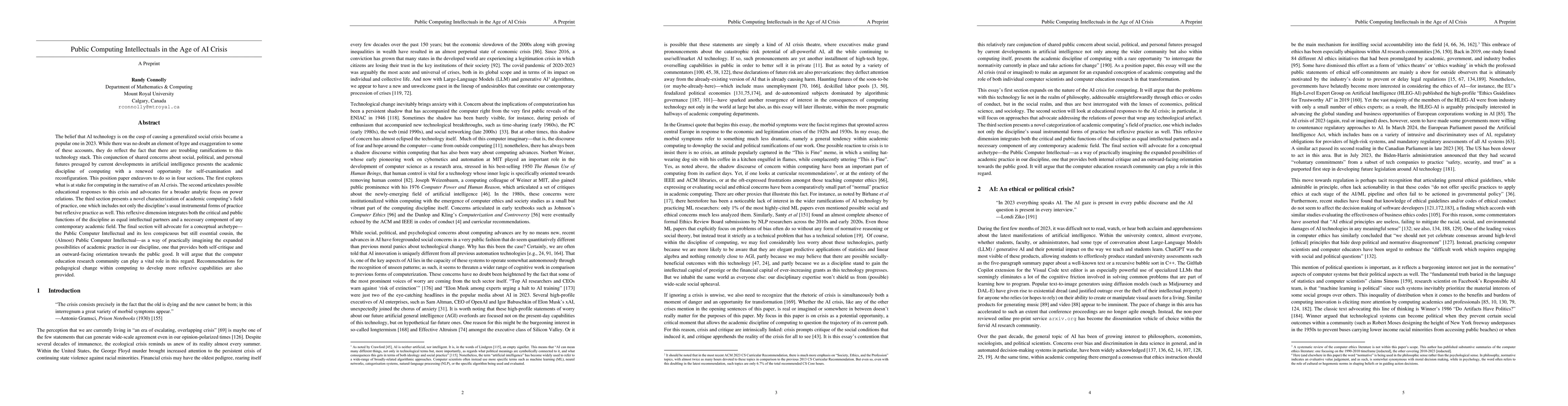 The belief that AI technology is on the cusp of causing a generalized social crisis became a popular one in 2023. While there was no doubt an element of hype and exaggeration to some of these accounts, they do reflect the fact that there are troubling ramifications to this technology stack. This conjunction of shared concerns about social, political, and personal futures presaged by current developments in artificial intelligence presents the academic discipline of computing with a renewed opportunity for self-examination and reconfiguration. This position paper endeavors to do so in four sections. The first explores what is at stake for computing in the narrative of an AI crisis. The second articulates possible educational responses to this crisis and advocates for a broader analytic focus on power relations. The third section presents a novel characterization of academic computing's field of practice, one which includes not only the discipline's usual instrumental forms of practice but reflexive practice as well. This reflexive dimension integrates both the critical and public functions of the discipline as equal intellectual partners and a necessary component of any contemporary academic field. The final section will advocate for a conceptual archetype--the Public Computer Intellectual and its less conspicuous but still essential cousin, the (Almost) Public Computer Intellectual--as a way of practically imagining the expanded possibilities of academic practice in our discipline, one that provides both self-critique and an outward-facing orientation towards the public good. It will argue that the computer education research community can play a vital role in this regard. Recommendations for pedagogical change within computing to develop more reflexive capabilities are also provided.