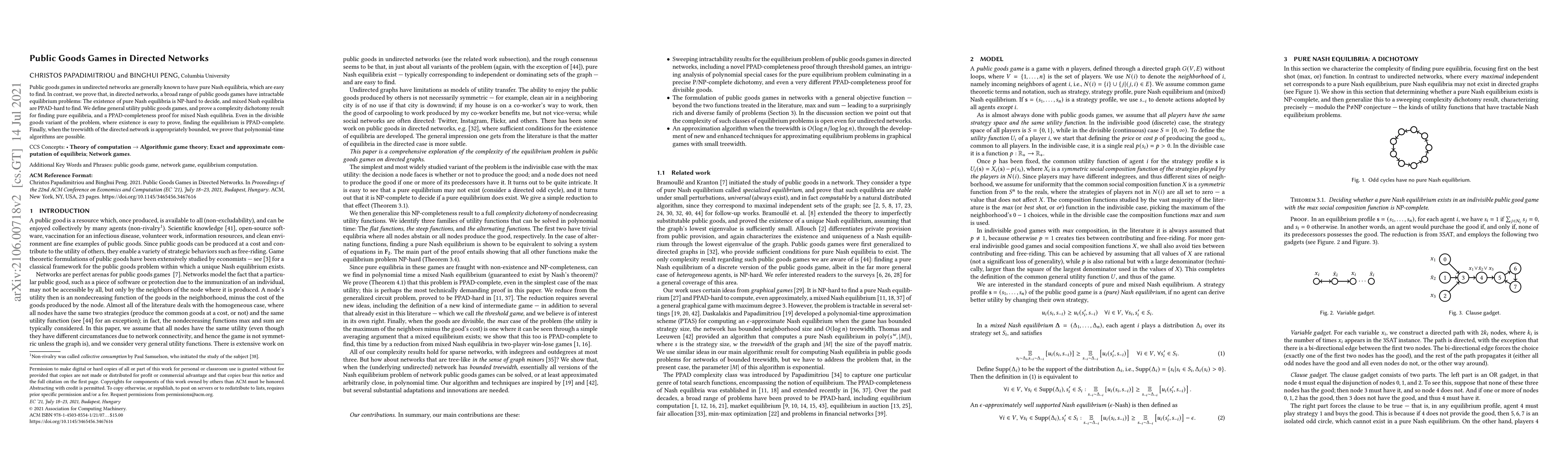 This paper investigates public goods games in directed networks, demonstrating that finding pure Nash equilibria is NP-hard and mixed Nash equilibria are PPAD-hard. It establishes complexity results for both pure and mixed equilibria, and shows polynomial-time solutions when the network's treewidth is bounded.